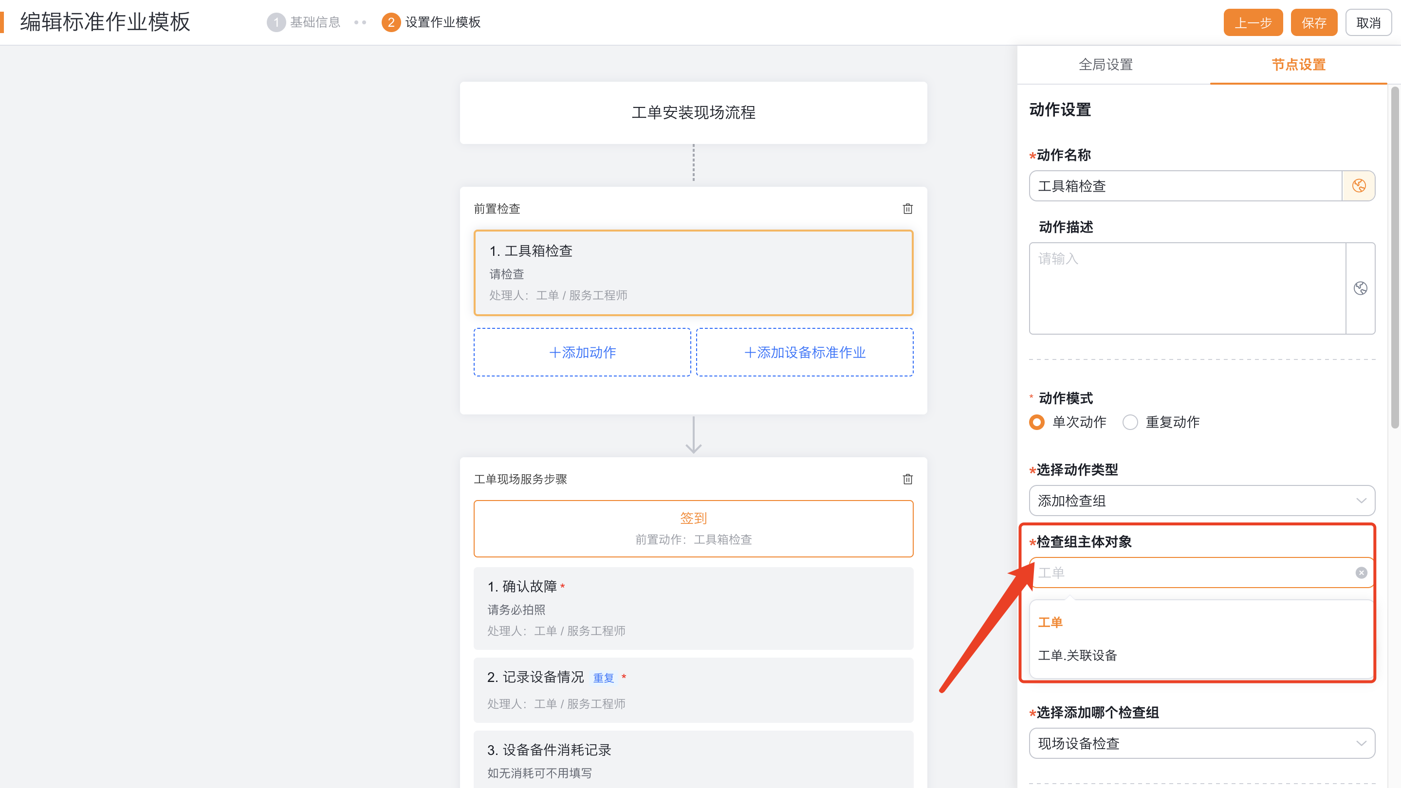 - 目标主体:工单、工单.设备(请确保工单.设备为必填)。即是针对触发当前标准作业的工单为检查组的主体还是针对针对触发当前标准作业的工单关联的设备为主体。