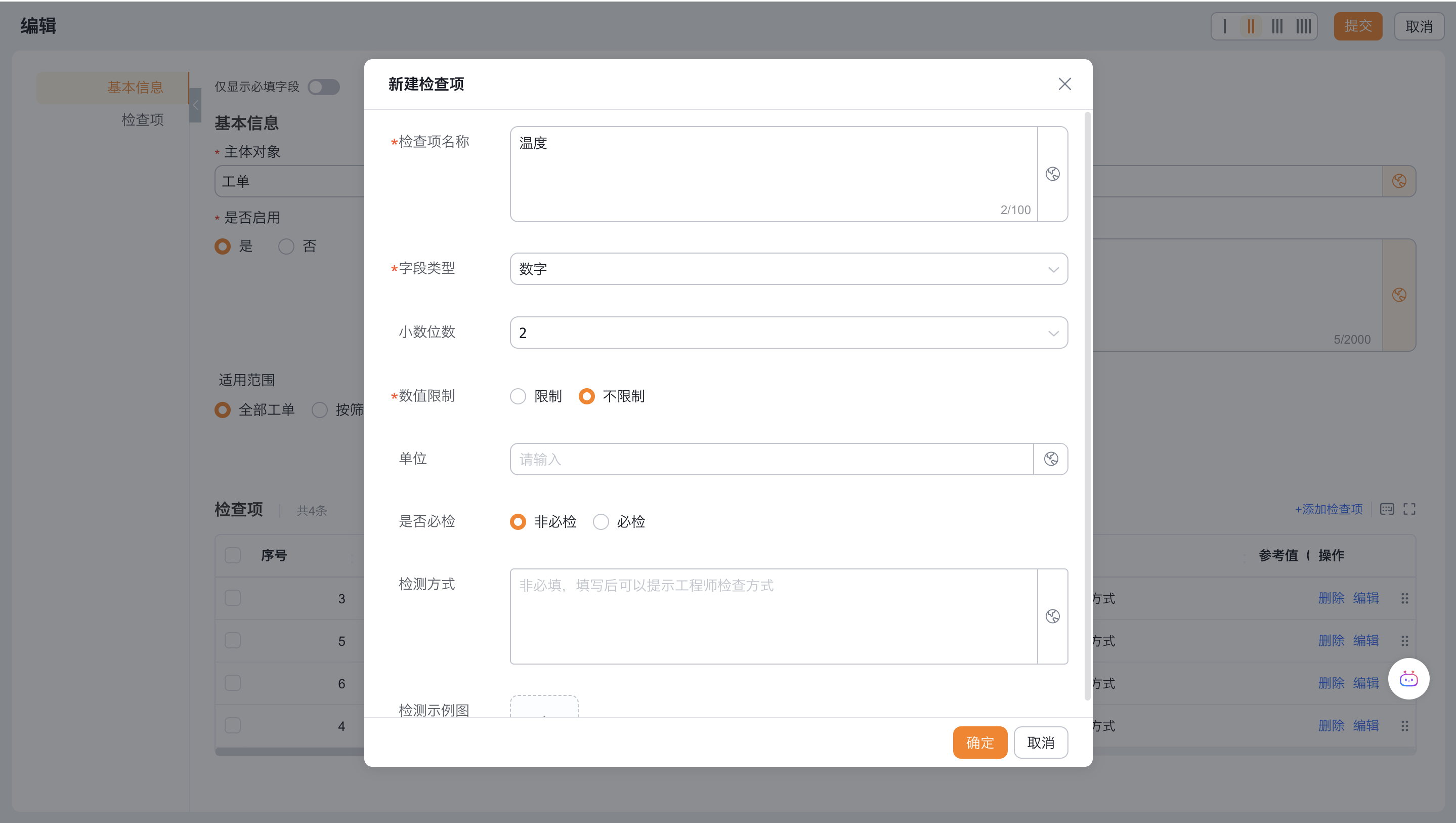 - 参考值:仅对数字类型的检查项,可以设置最大参考值和最小参考值(超出参考值范围时,将会提示)
