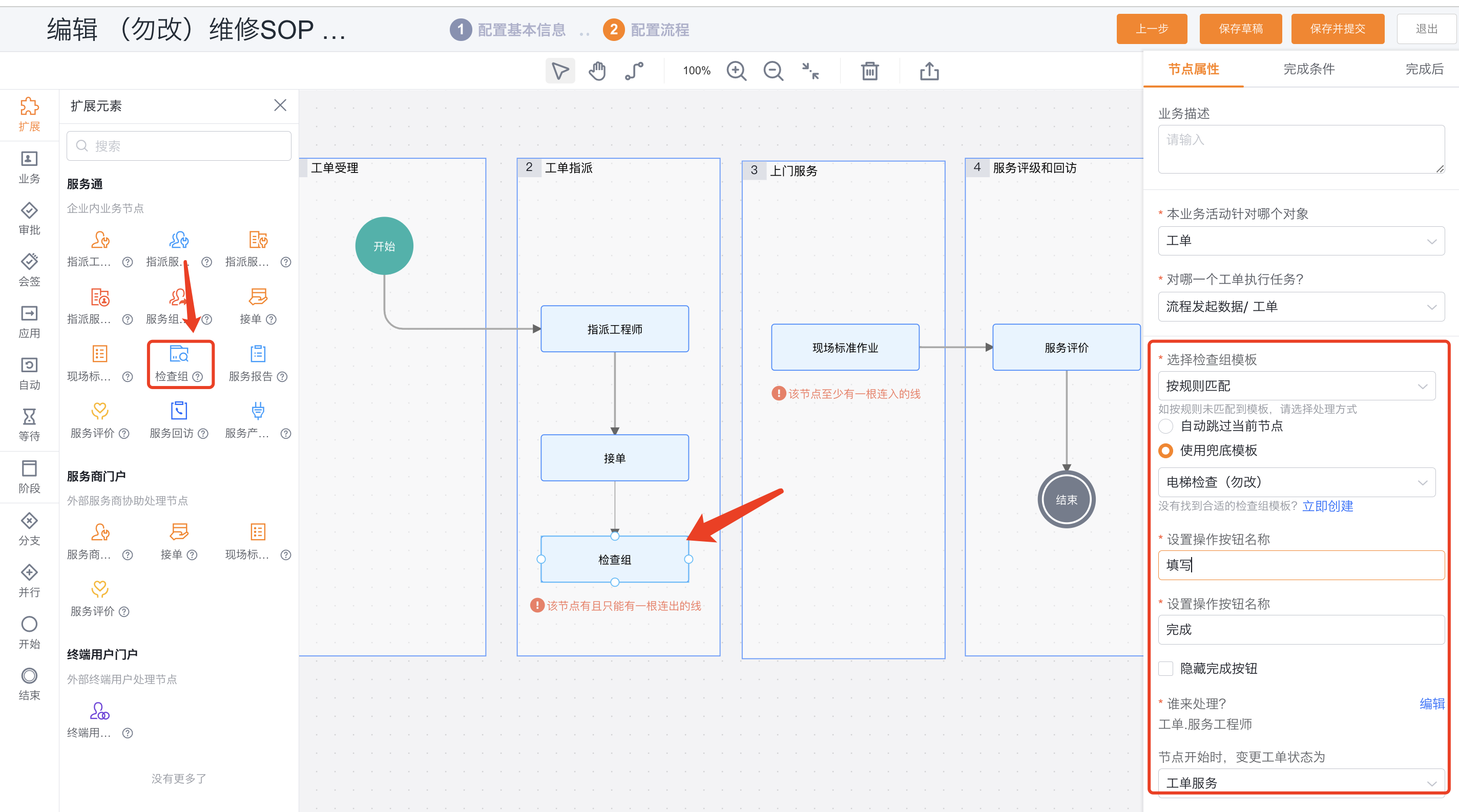 在流程节点中配置检查组节点,工程师进行检查和提交检查内容