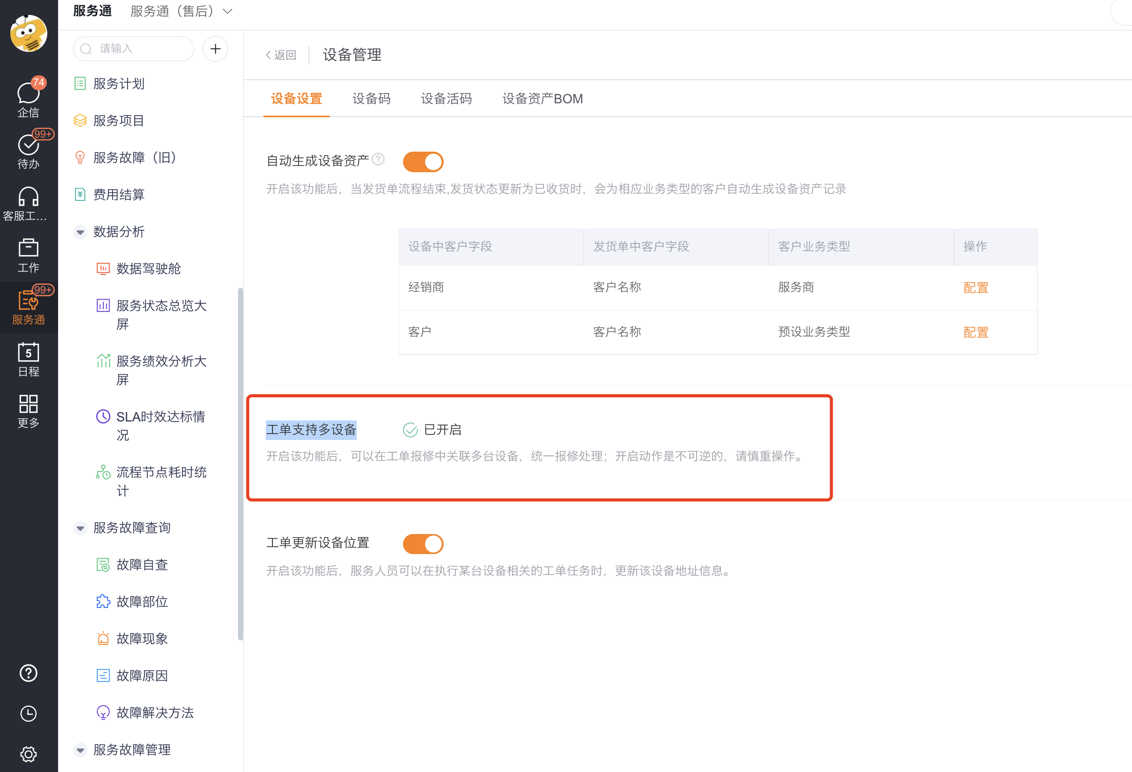 前提:启用了“多设备工单”,即增加了从对象【工单设备】CasesDeviceObj