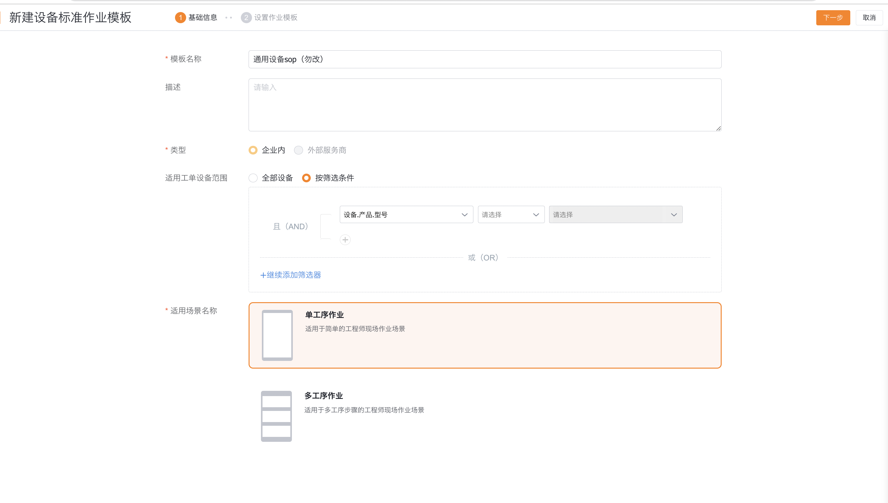 2.填写标设备准作业模板名称、设备适用条件、描述,并选择标准作业工序布局