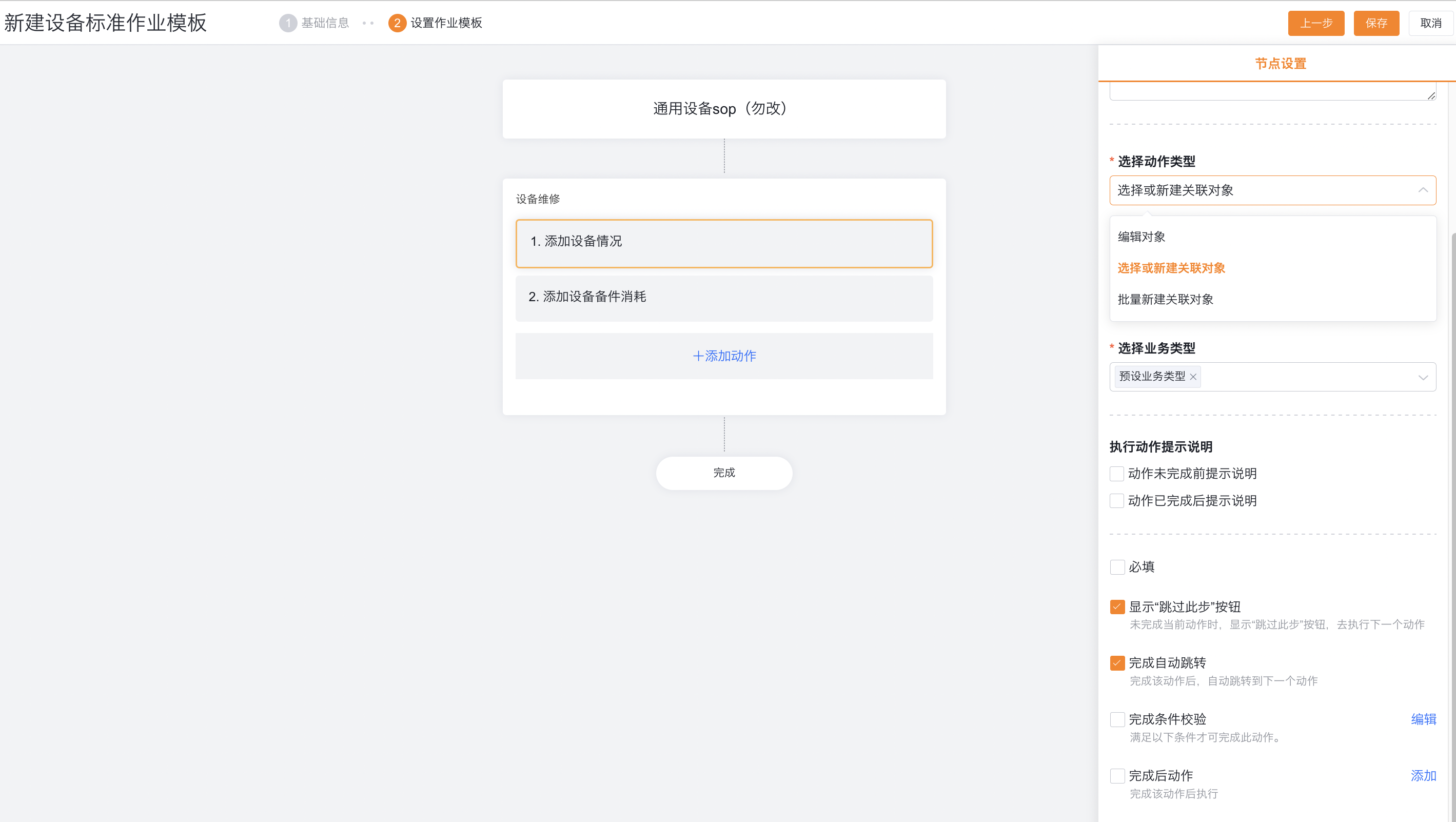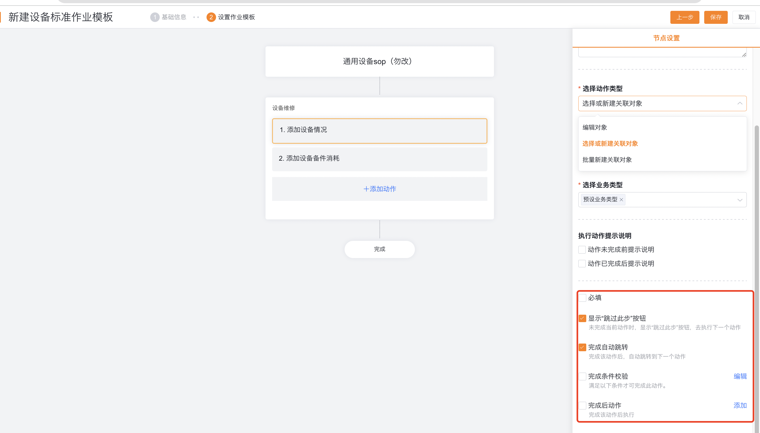 - 前置动作:未完成前置动作前不能执行此动作,仅支持当前工序的动作