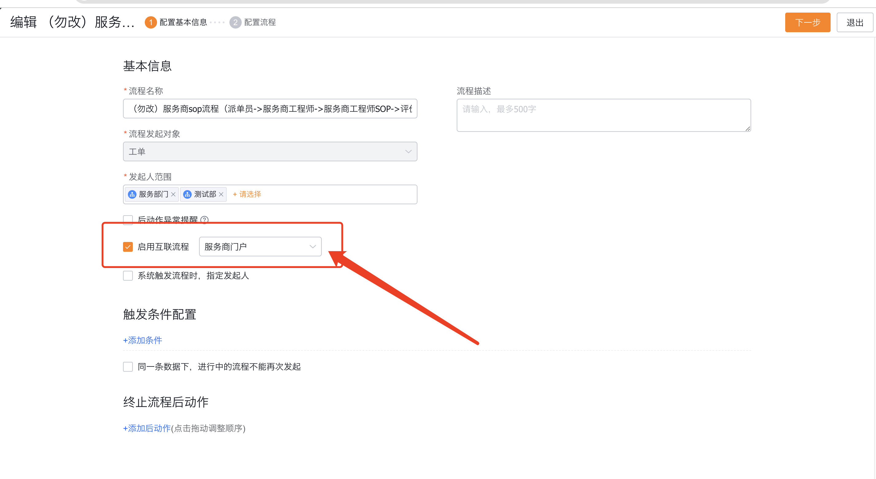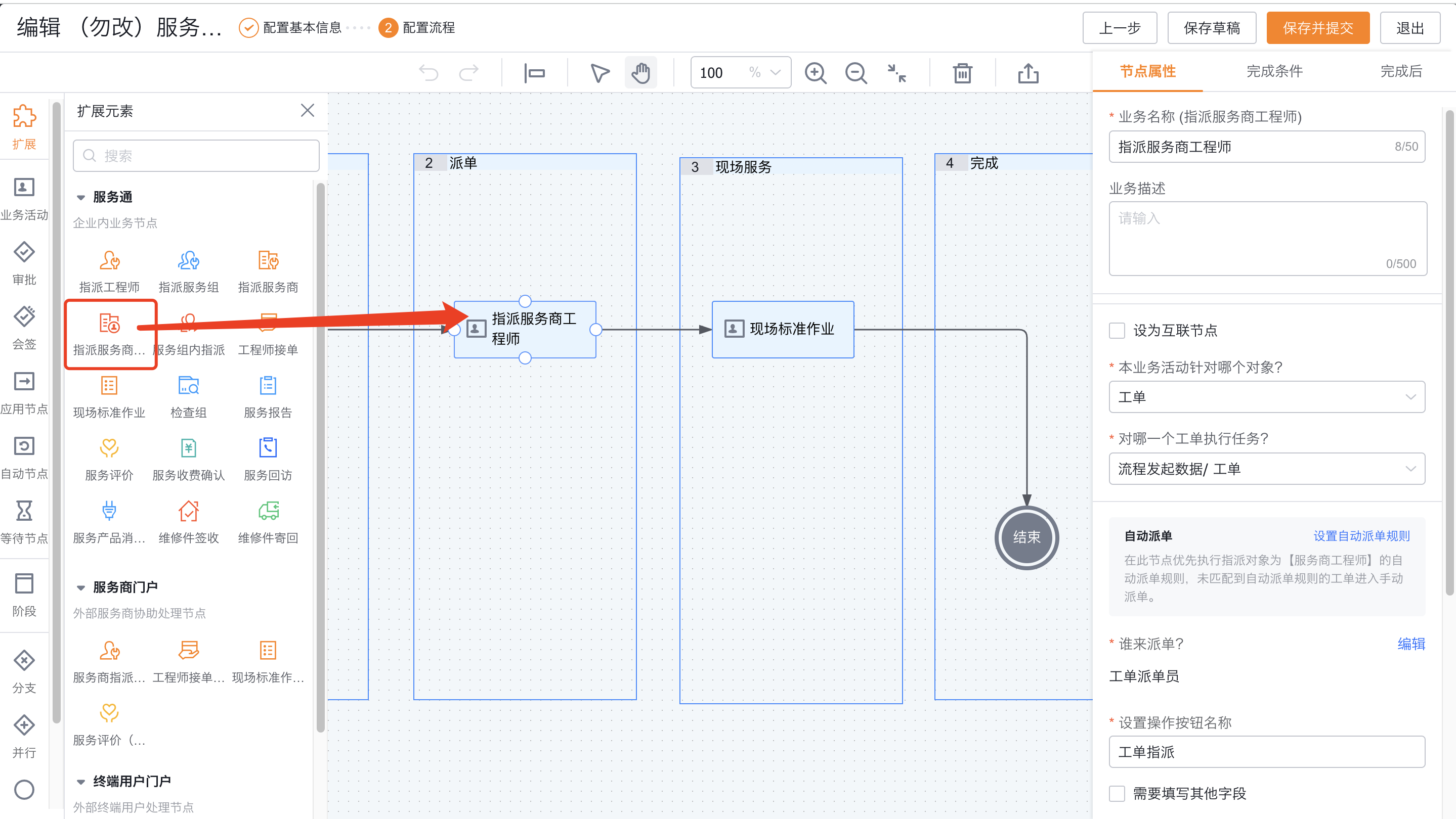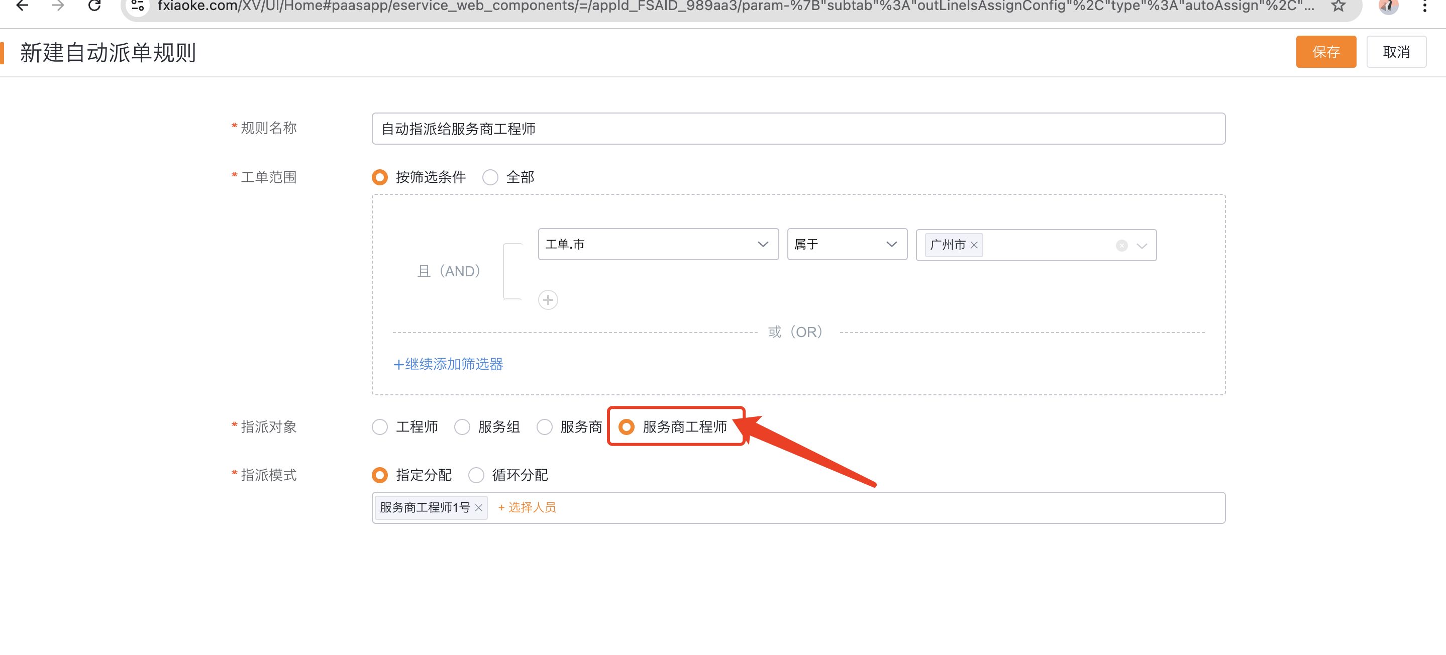 - 配置好互联服务流程后,可设置自动指派规则,将符合条件的工单自动指派给服务商工程师。