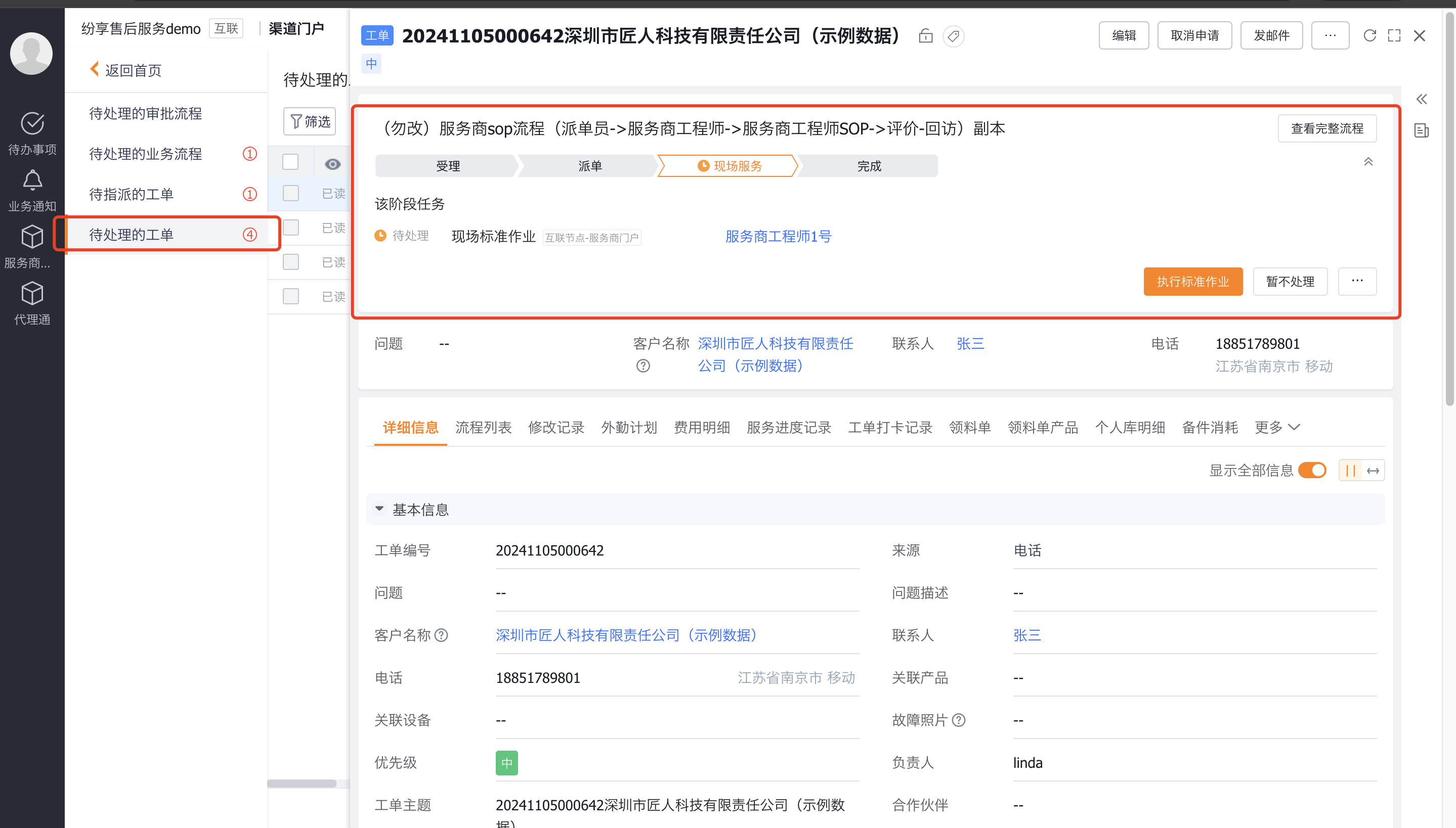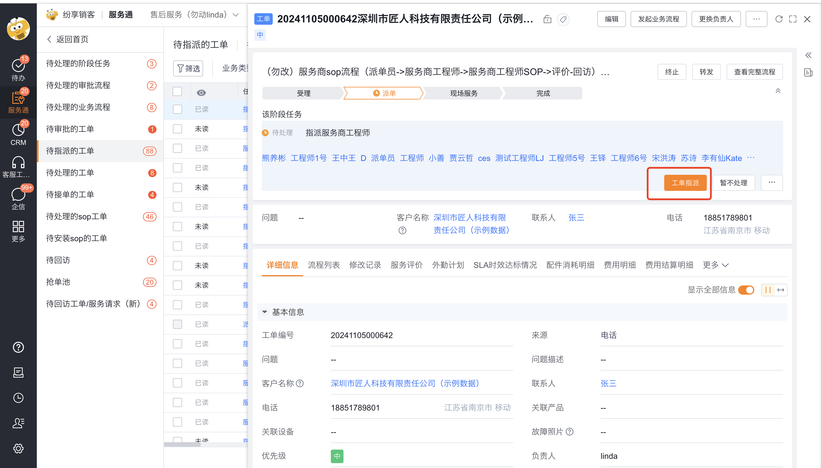 - 指派服务商工程师后,系统会自动回填派单相关字段到【工单】对象上