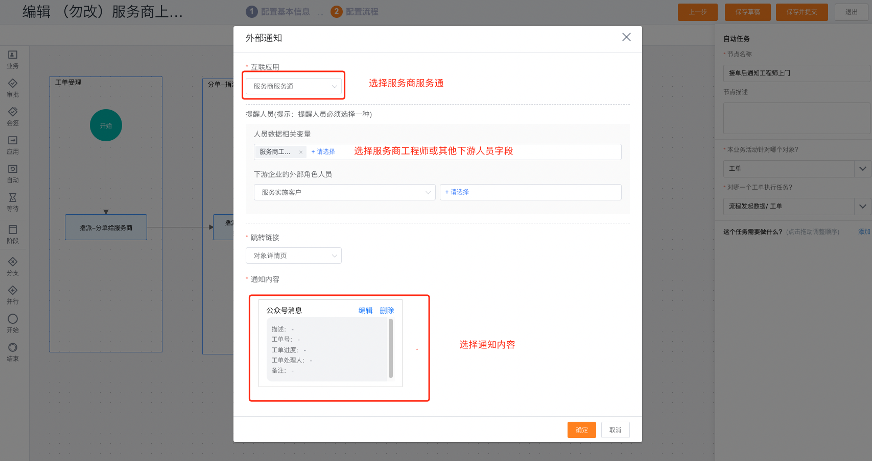- 外部通知设置,选择应用“服务商服务通”;通知人员:服务商工程师、服务实施客户>服务商工程师;