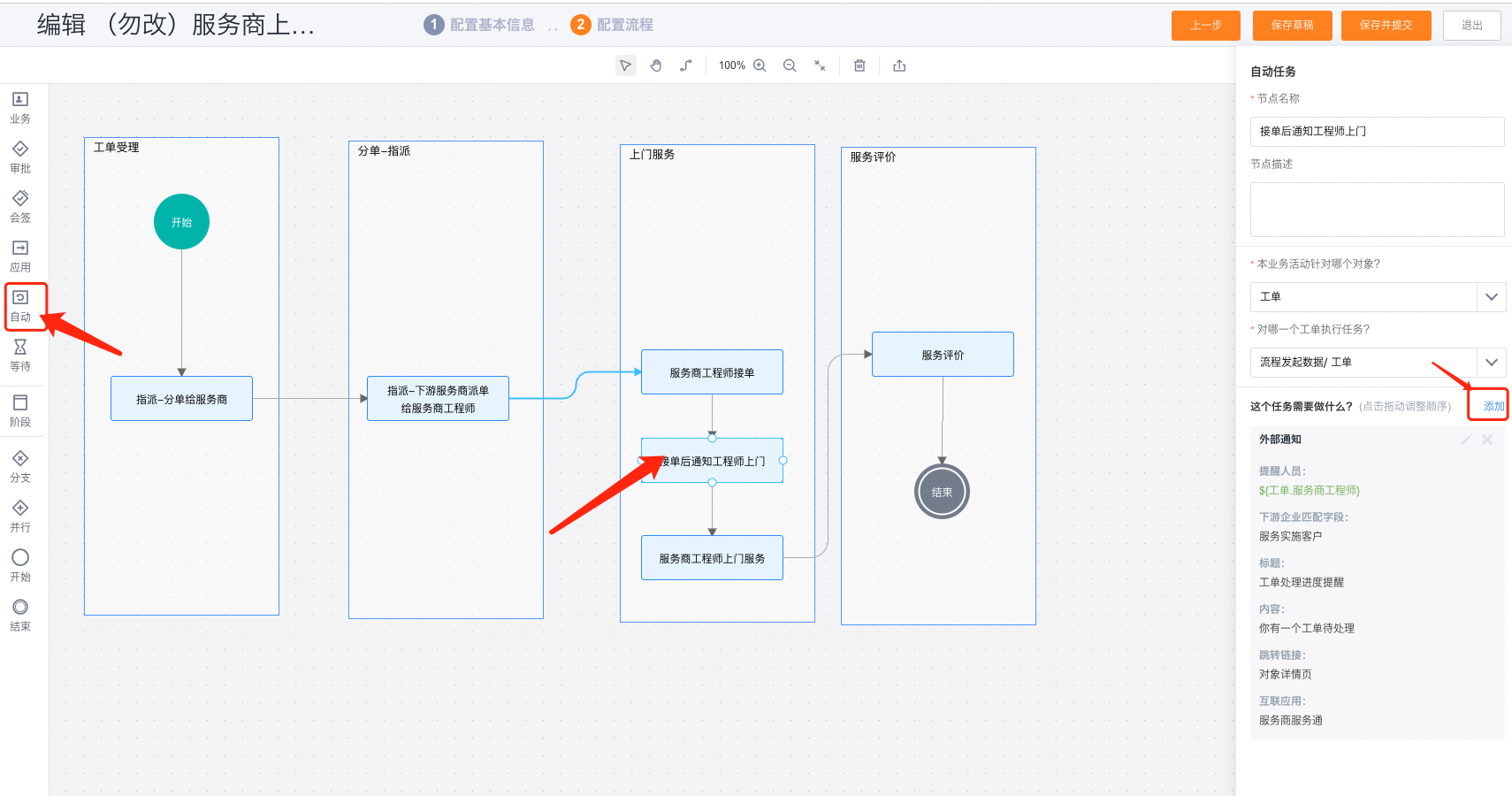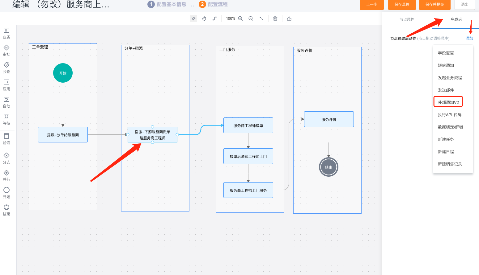 流程外部通知:特指通知外部服务商派单员或工程师处理,