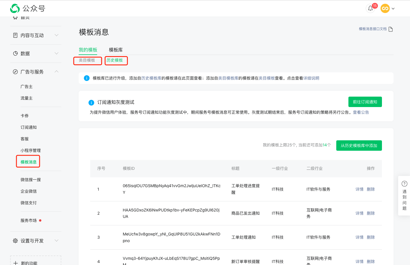 注意:如为找到对应模板,请登录到微信公众后台(https://mp.weixin.qq.com),先添加公众号模板消息。