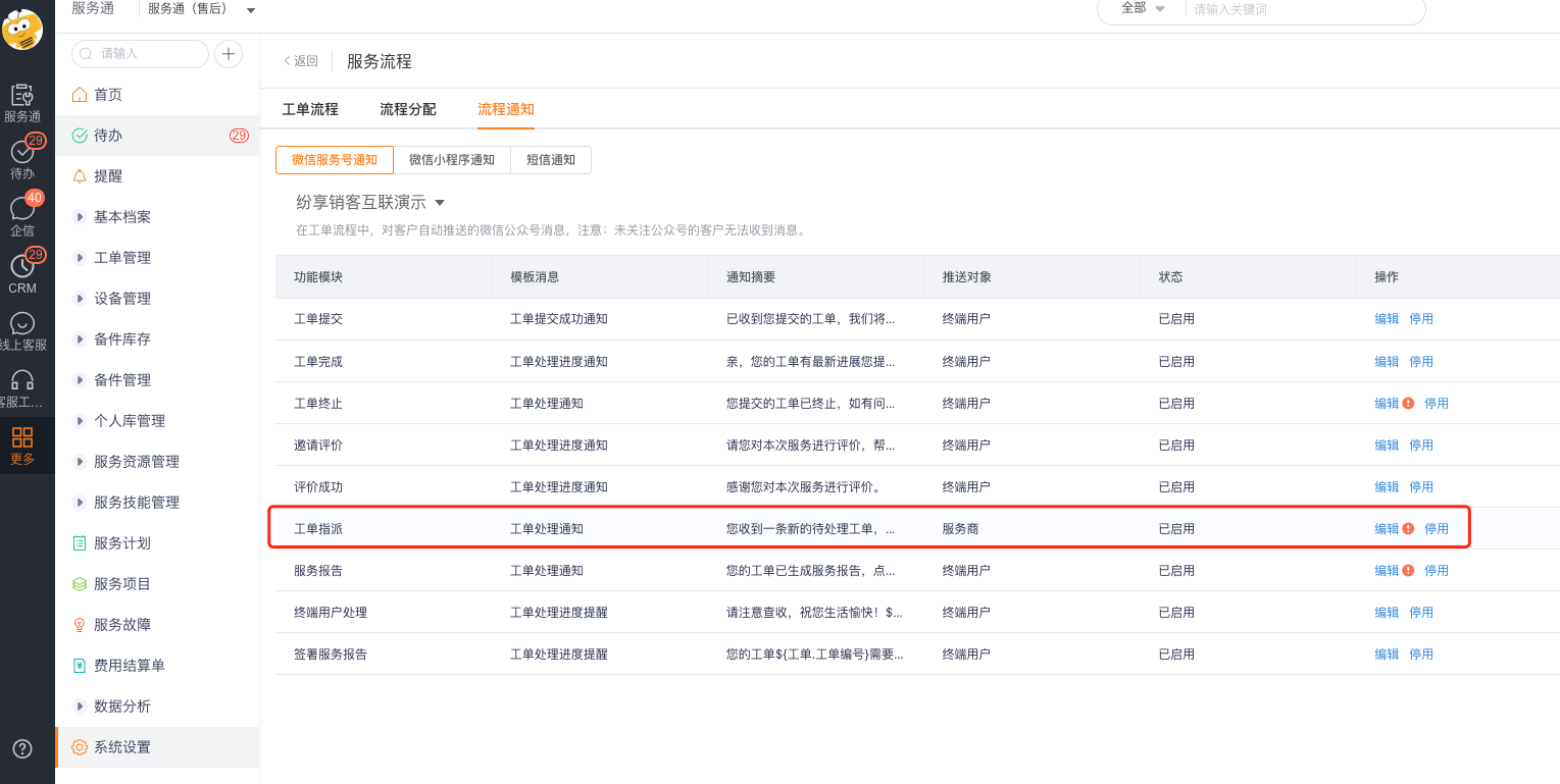 - 在工单流程的应用节点中,系统对服务商自动推送的微信公众号消息,注意:未在公众号绑定的服务商人员无法收到消息。