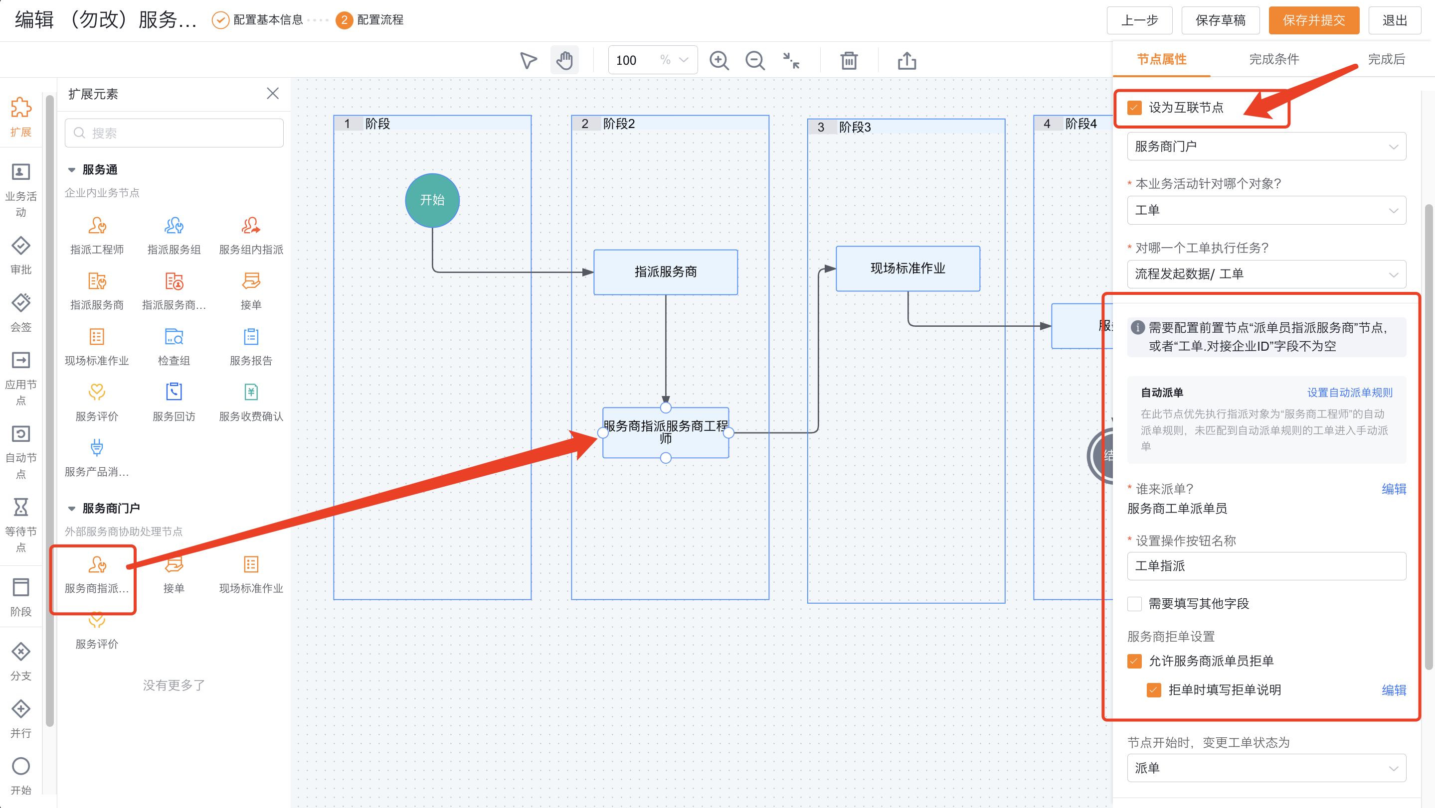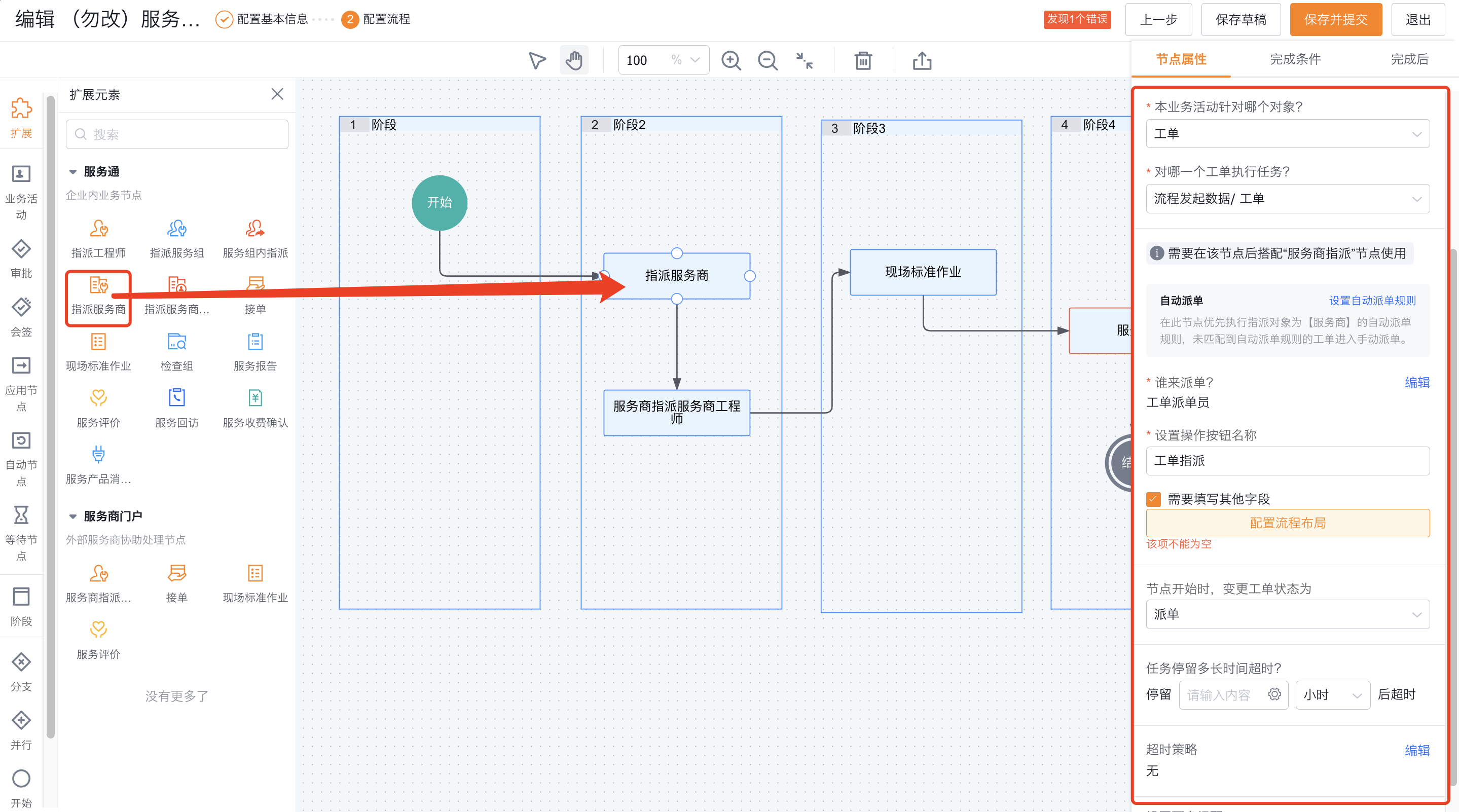 - 在流程节点设置第二个派单节点:服务商指派服务商工程师节点
