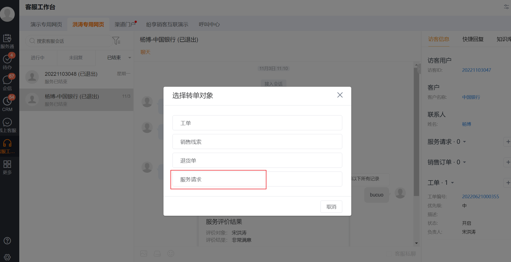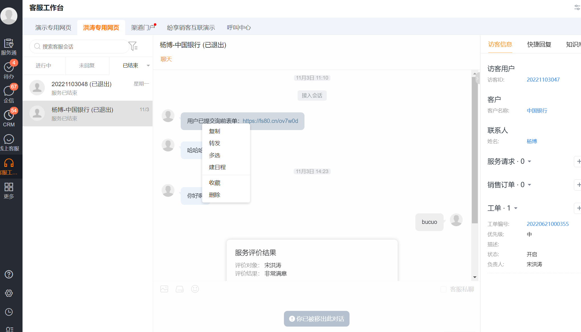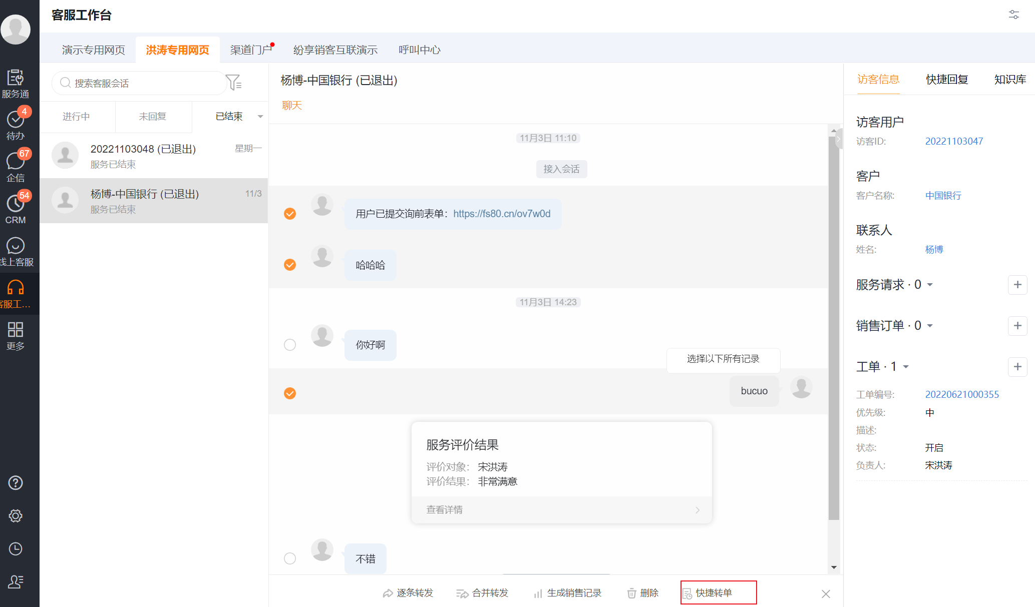 在客服工作台的聊天界面,鼠标右键进行消息多选后,即可出现快捷转单的按钮,根据实际需要,选中需要转单的聊天记录,进行转单即可。