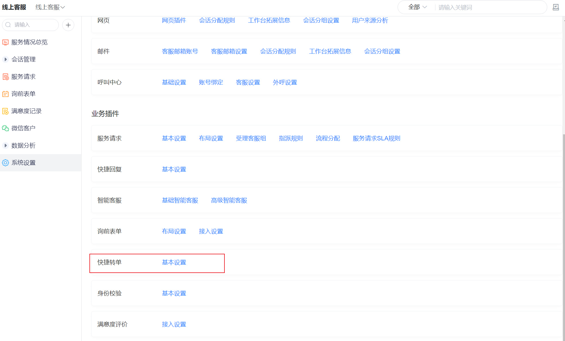 配置路径如下:线上客服--->快捷转单设置