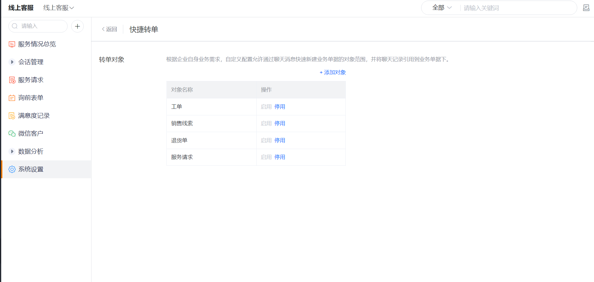 添加对象完成后,系统会在该对象下自动预设会话记录、聊天记录字段,用来记录该单据的关联会话和聊天记录信息。