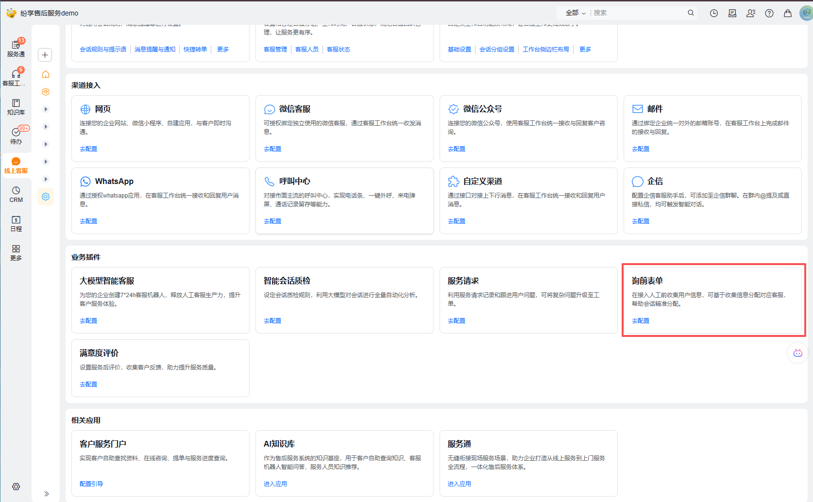 询前表单是线上客服应用的一个功能模块,设置路径为:线上客服--->业务插件--->询前表单