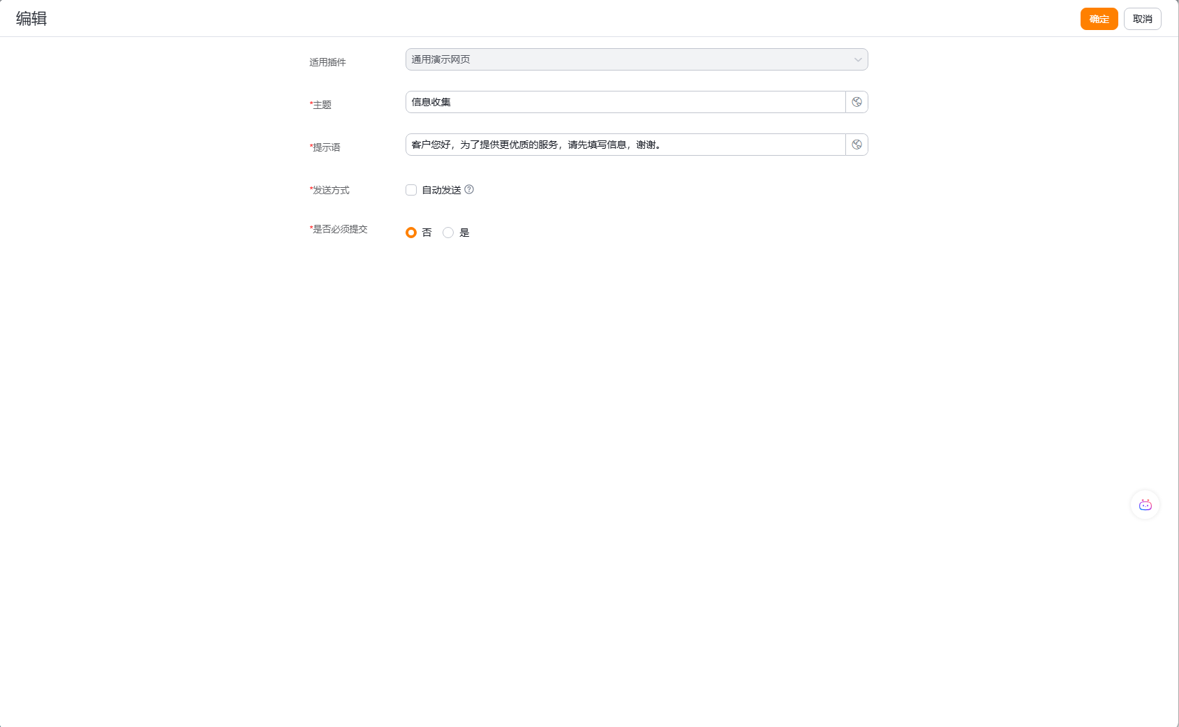 自动发送:勾选该选项后,在人工客服会话接入前,系统会自动发送询前表单给客户。