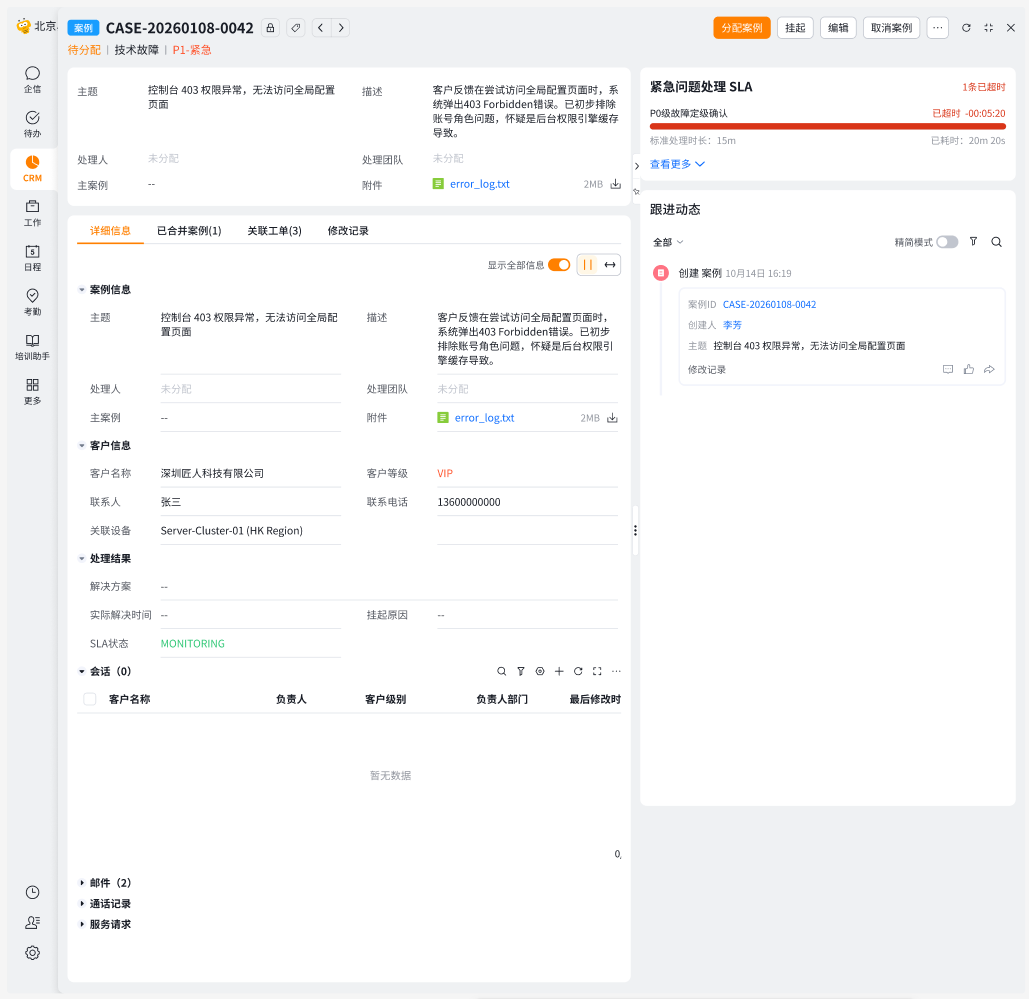针对需要升级处理的复杂问题,客服可在工作台内一键创建标准化服务请求/案例,并通过可配置的流程、分配规则与 SLA 机制,实现问题的高效流转、可追踪与可考核,确保服务质量稳定可控。