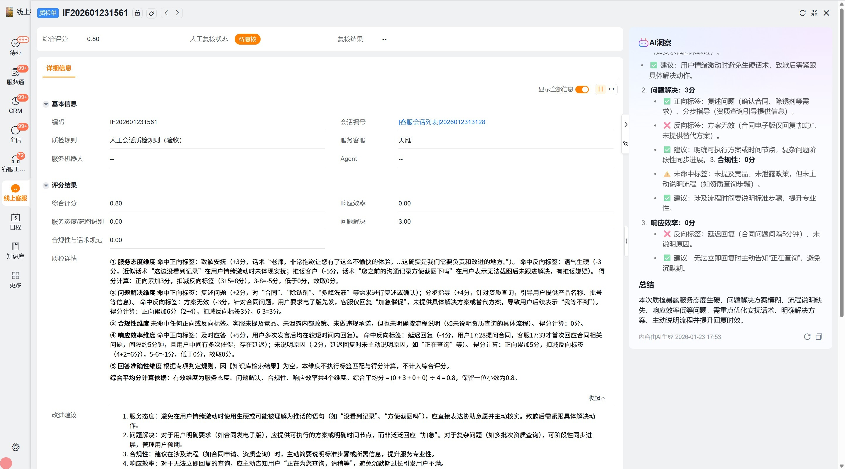 平台可基于预设规则与模型能力,对服务规范、响应时效、话术合规及情绪风险等关键维度进行识别与评估,自动发现潜在服务问题,减少人工抽检成本。