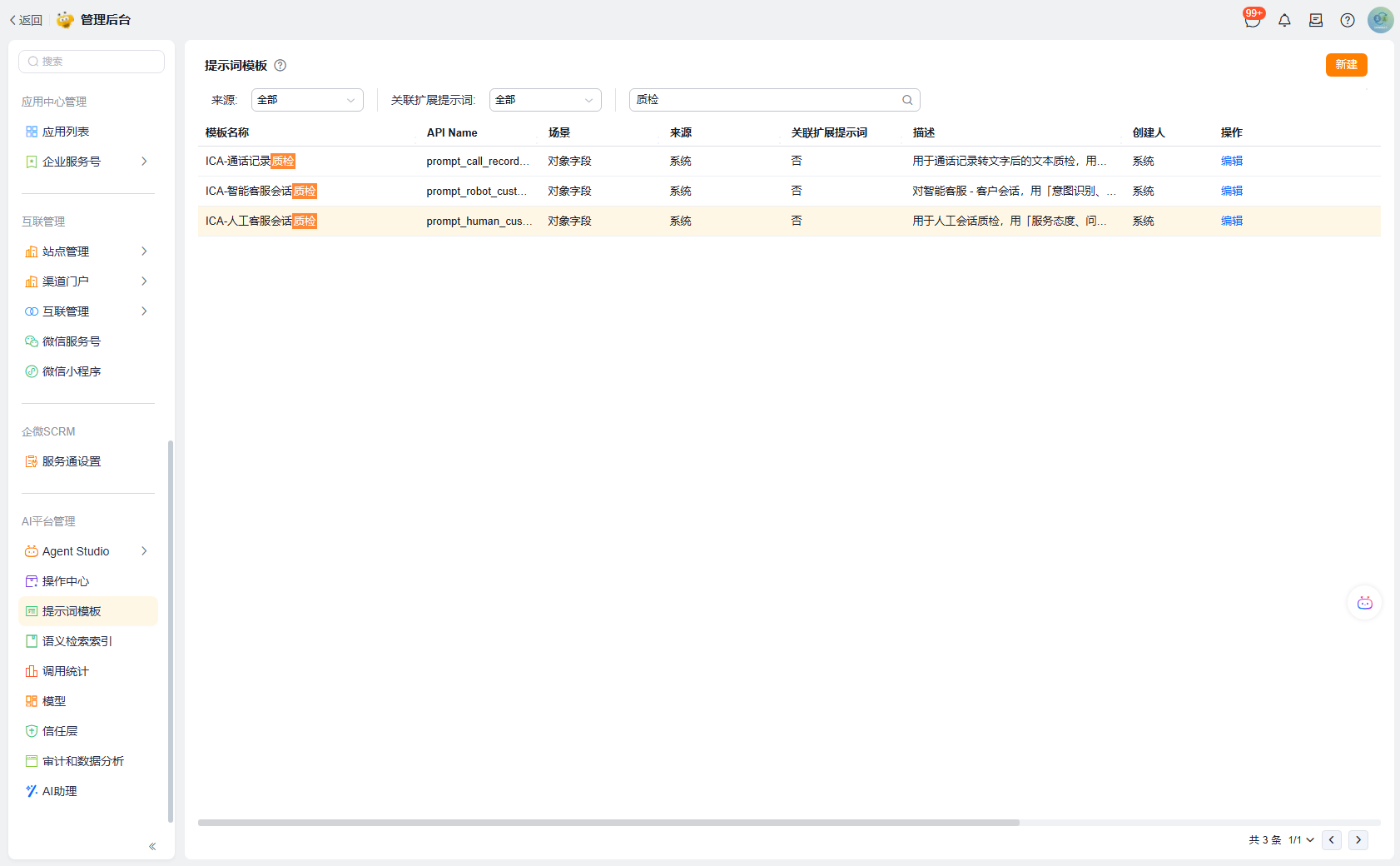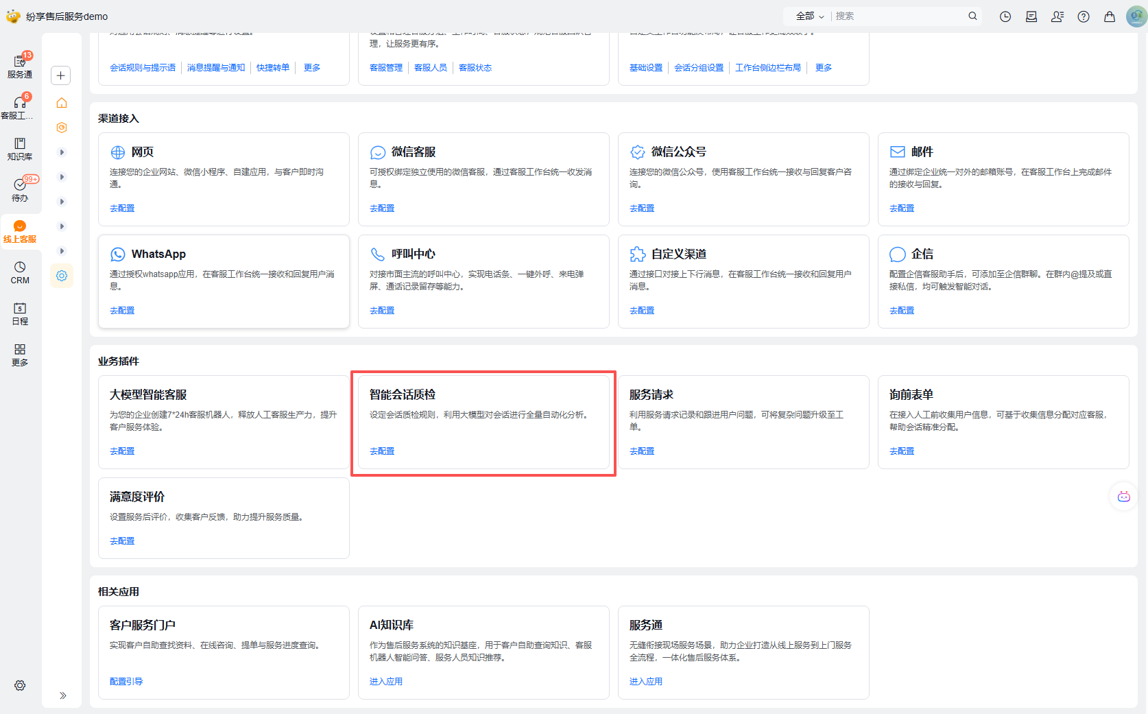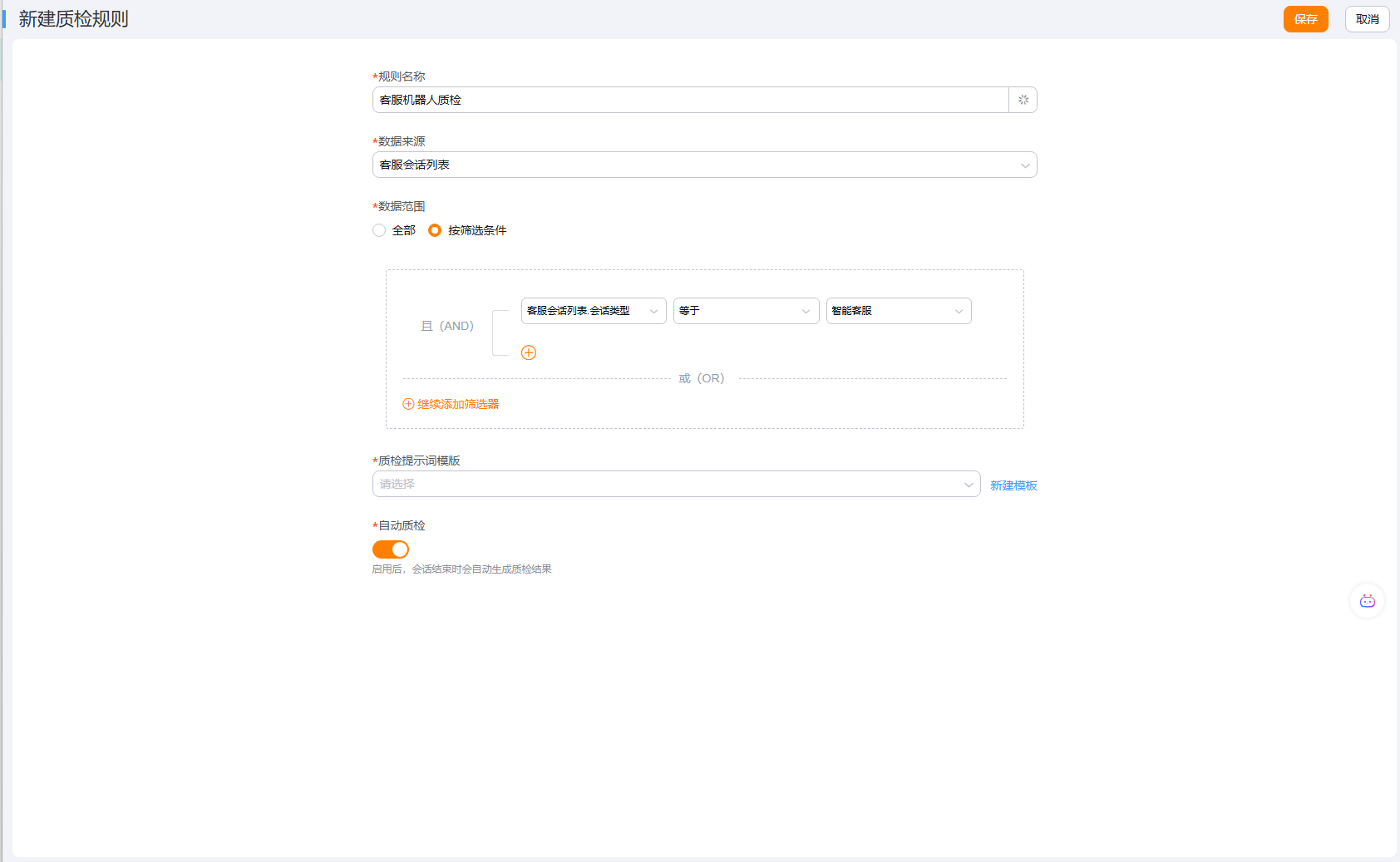 - 自动质检:建议打开,每次会话结束时后台会自动生成质检结果