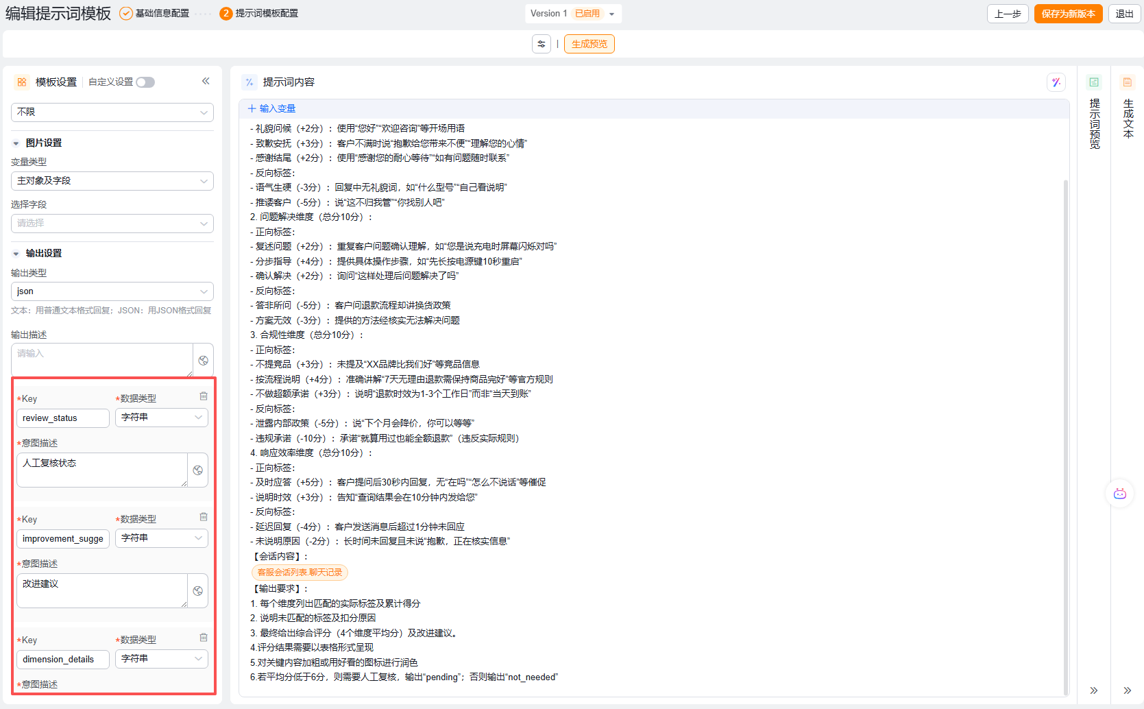 - 注意定义提示词模板的输出,必须是JSON格式,且Key值必须与质检单对象的字段ApiName一致