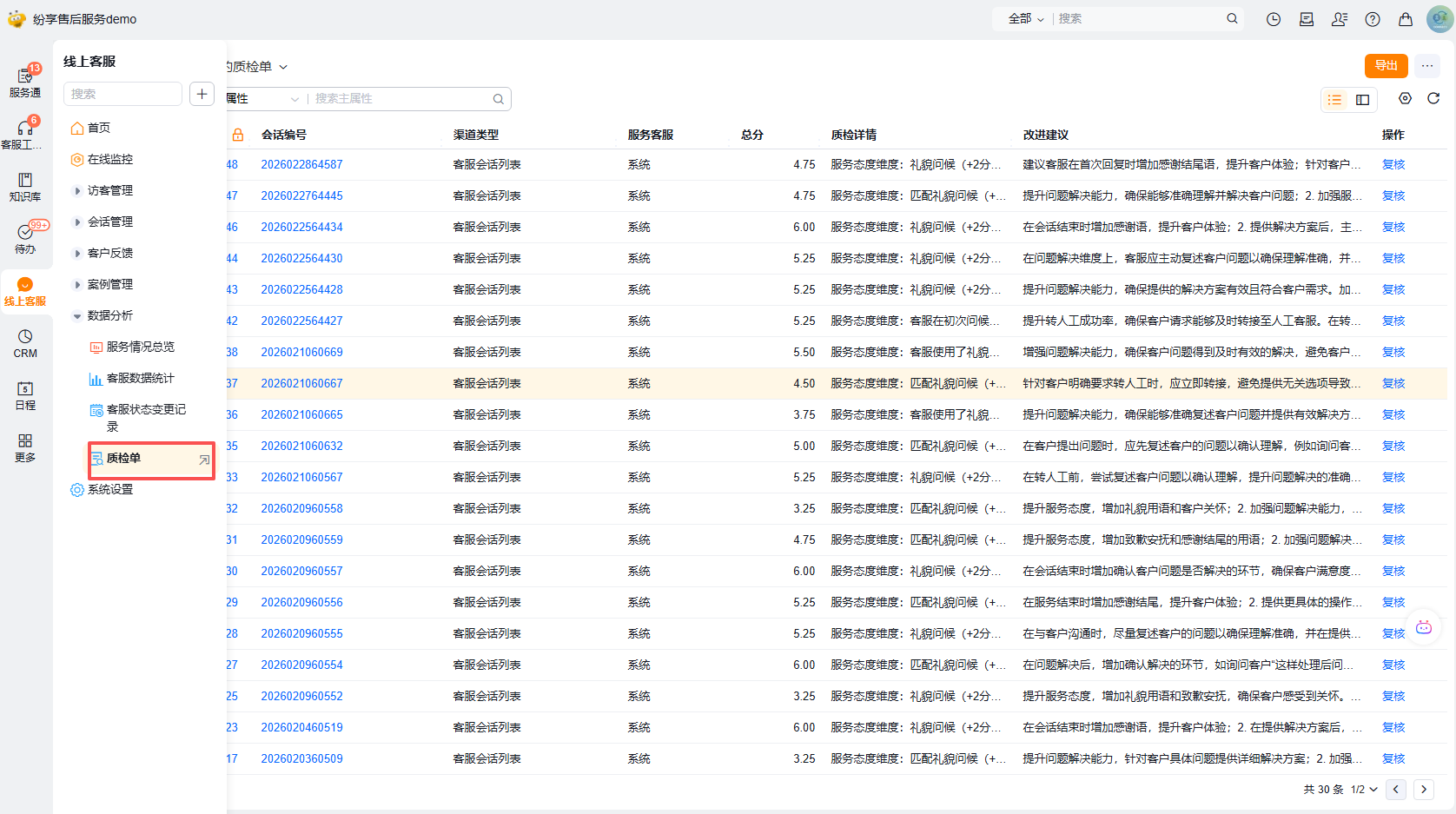 会话结束后,可在质检单模块查看质检结果