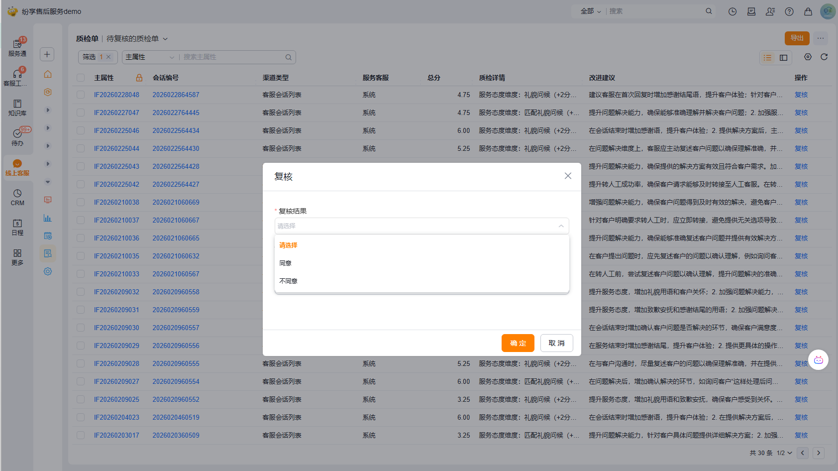 客服管理员可针对质检结果进行复核