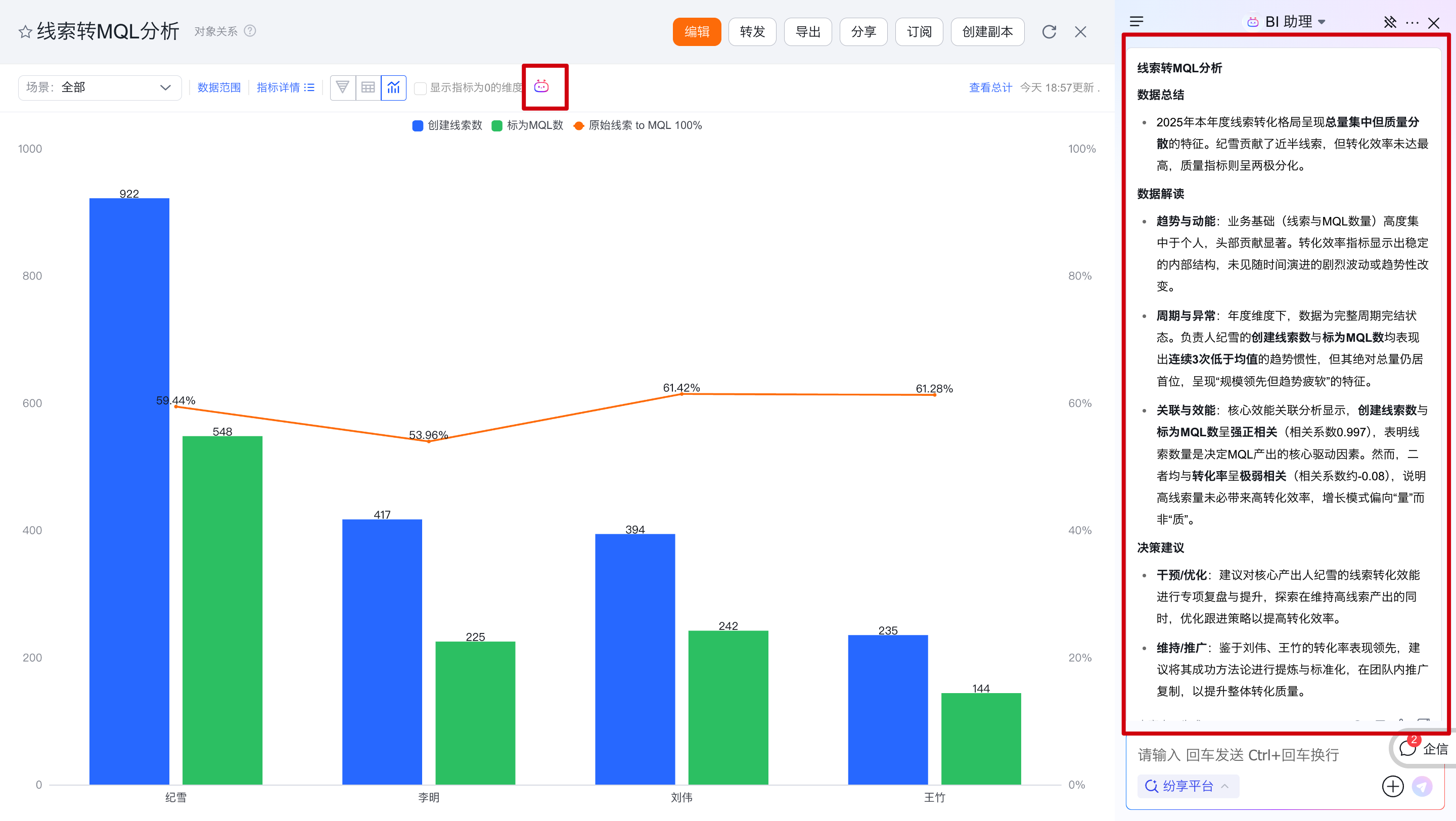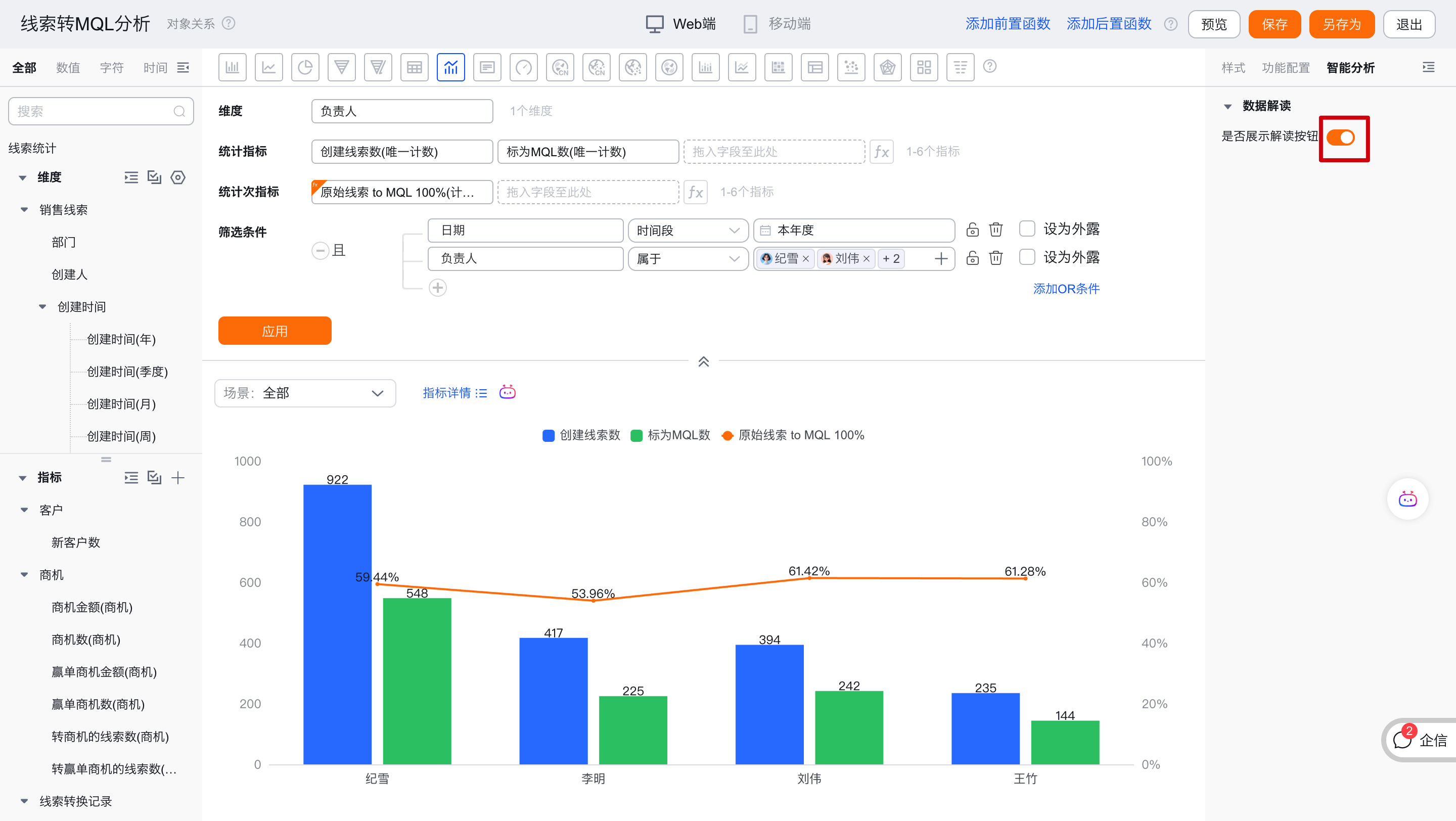 用户进入统计图编辑态时,可以在右侧配置区域开启数据解读按钮,开启后可以在查看统计图时点击按钮来解读当前统计图数据。