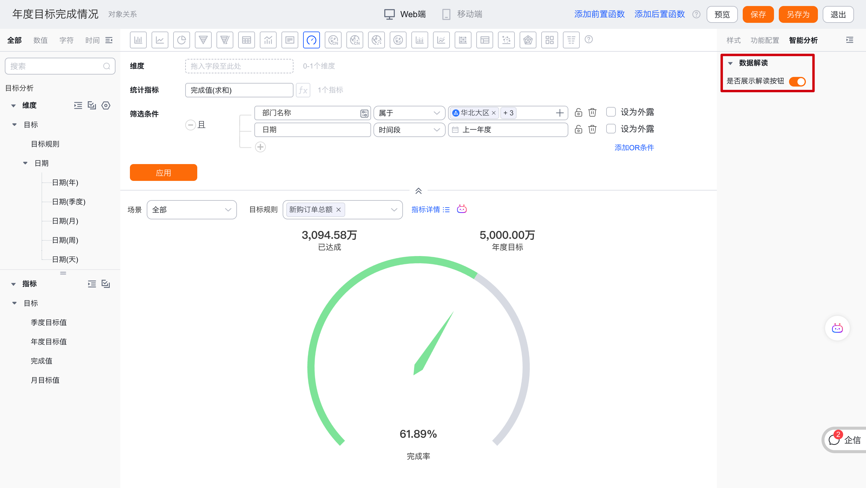 - 统计图可配置展示数据解读按钮,用户可在统计图详情页或者是卡片页面点击按钮对统计图进行数据解读。