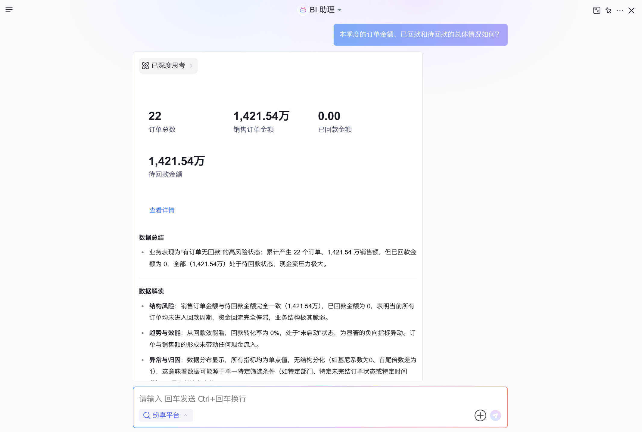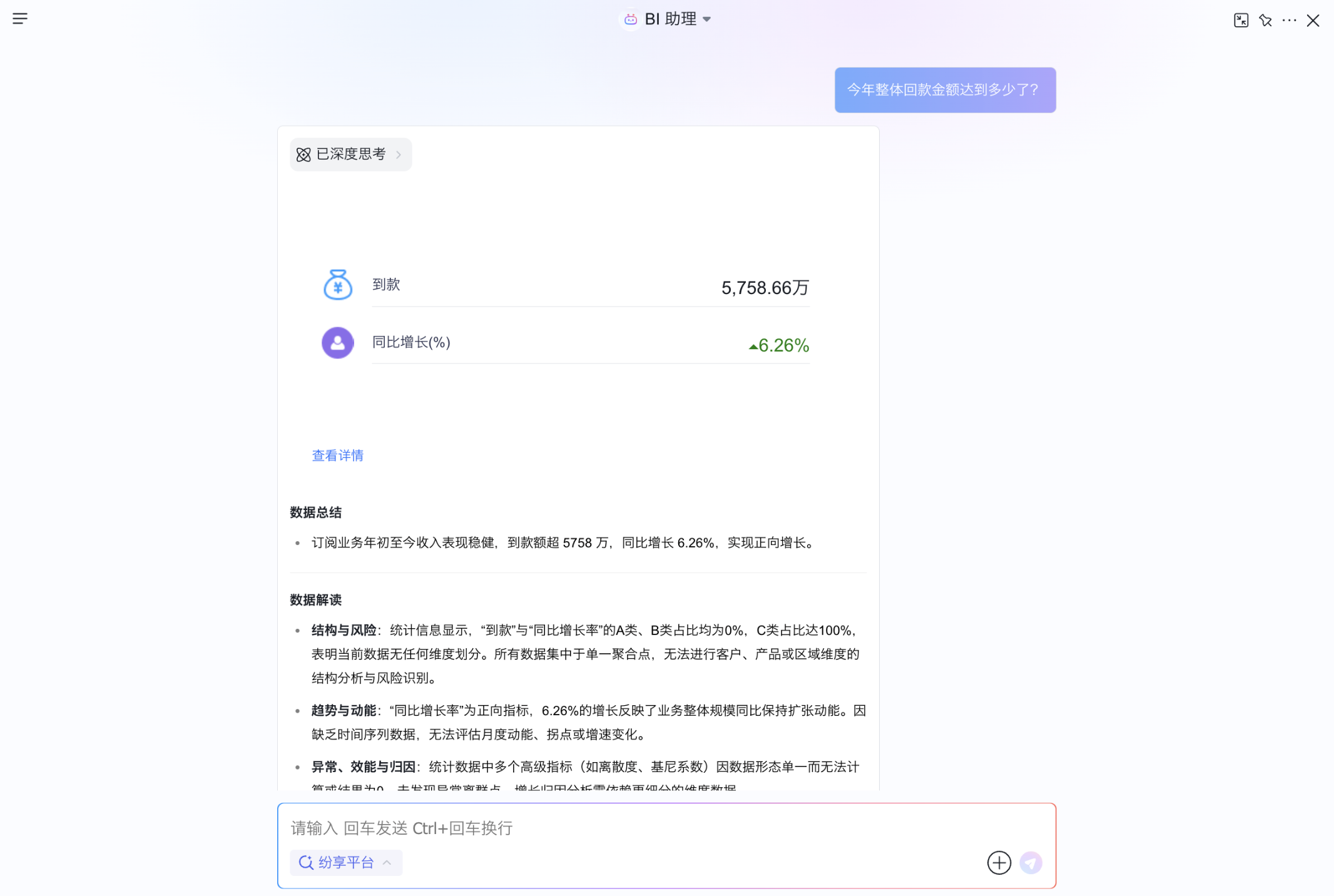 - 通过BI 助理召回统计图后,自动触发数据解读。