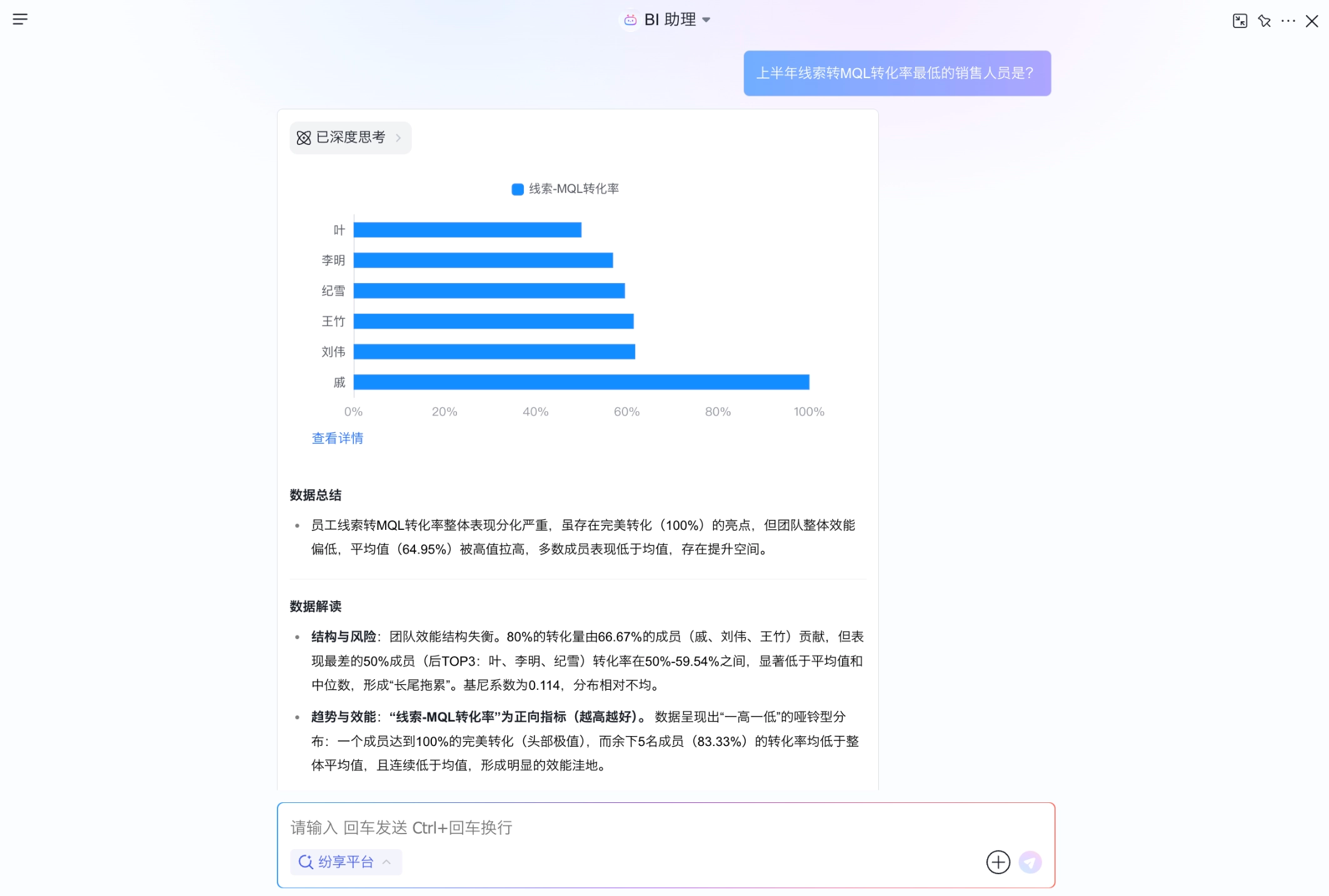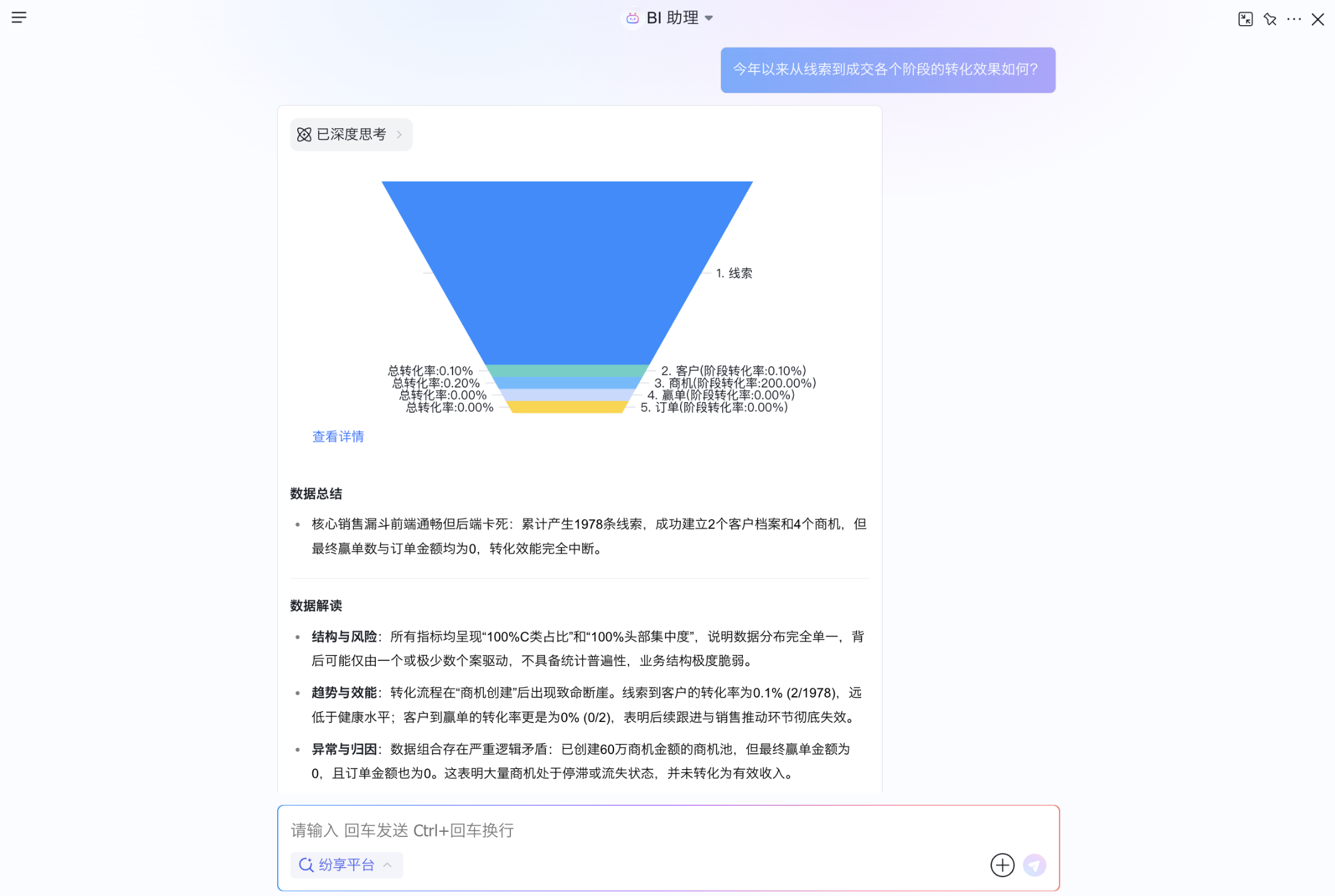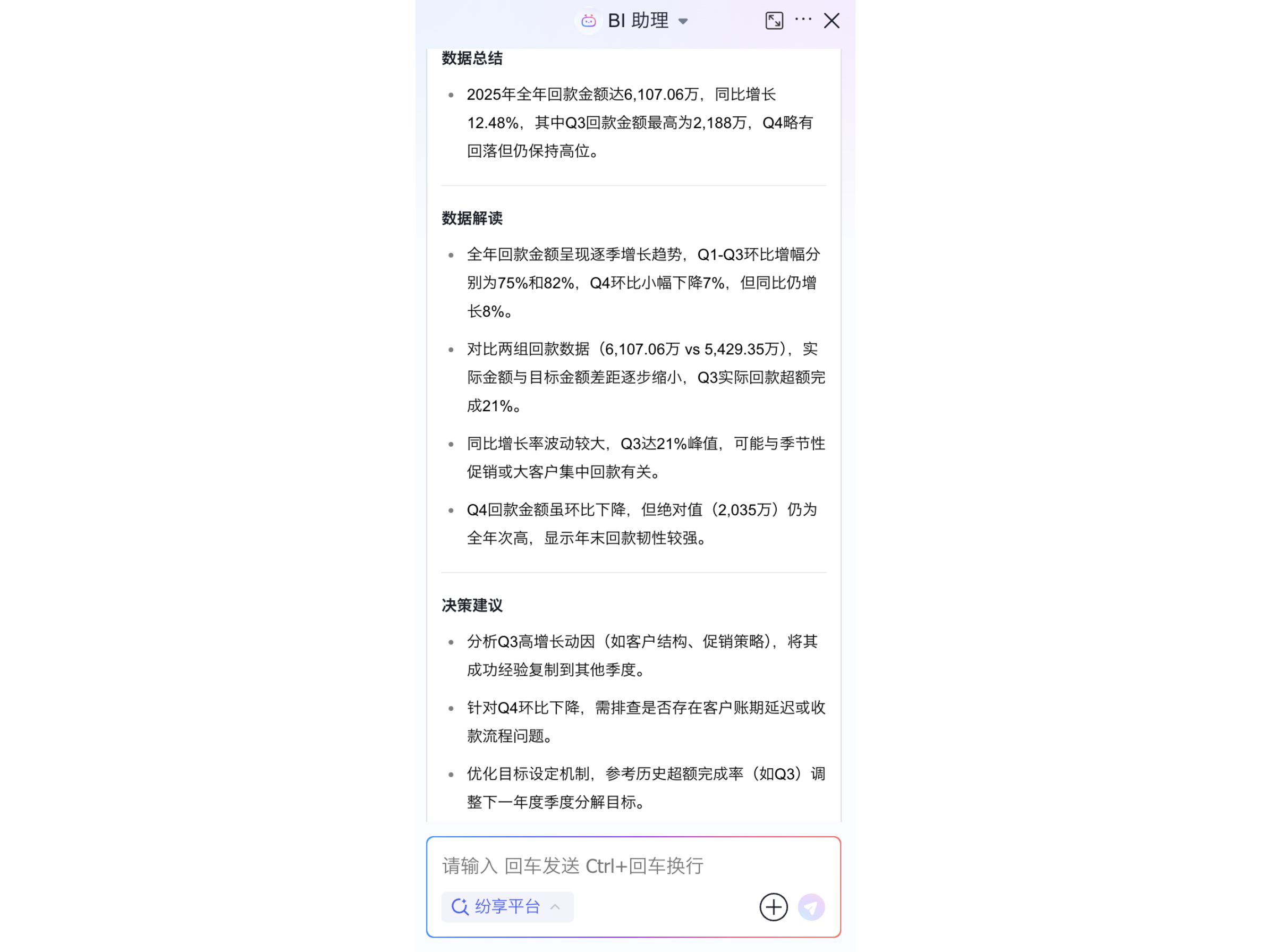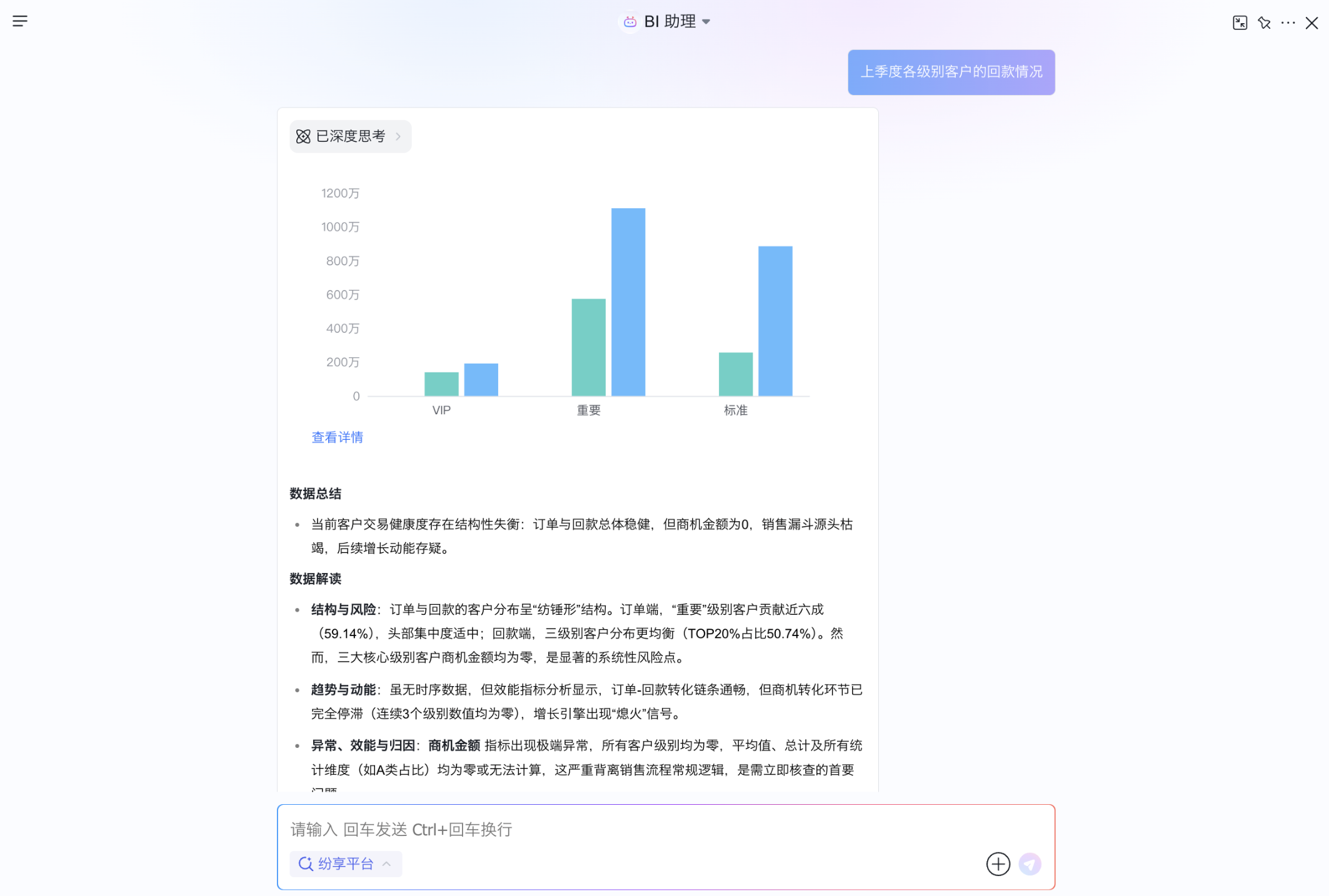 数据解读是 BI Agent 对召回的统计图数据进行智能分析,输出数据总结、数据解读及决策建议的功能,帮助用户快速理解数据背后的业务逻辑,无需手动计算或分析。