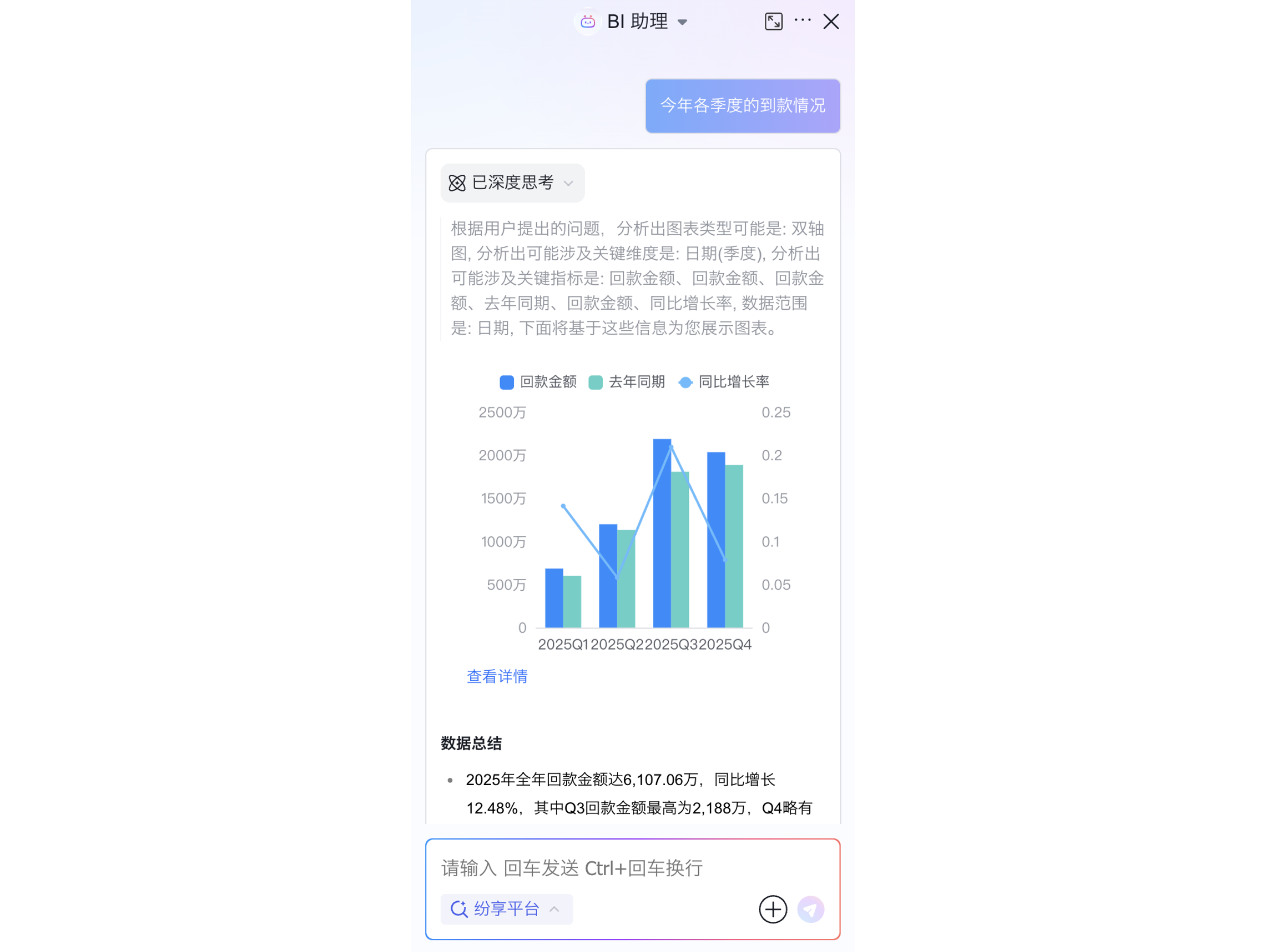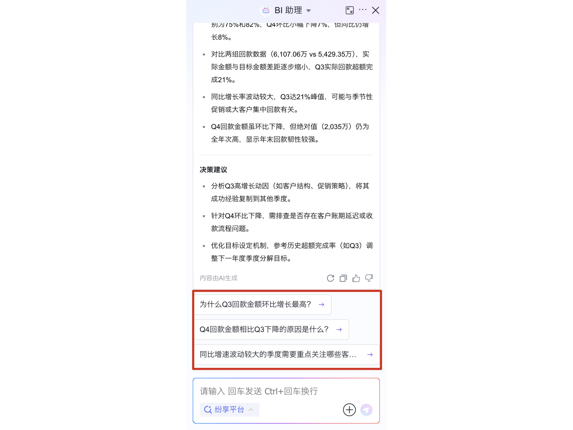 - 通过BI 助理召回统计图并完成数据解读后,在数据解读模块下方推送追问问题。