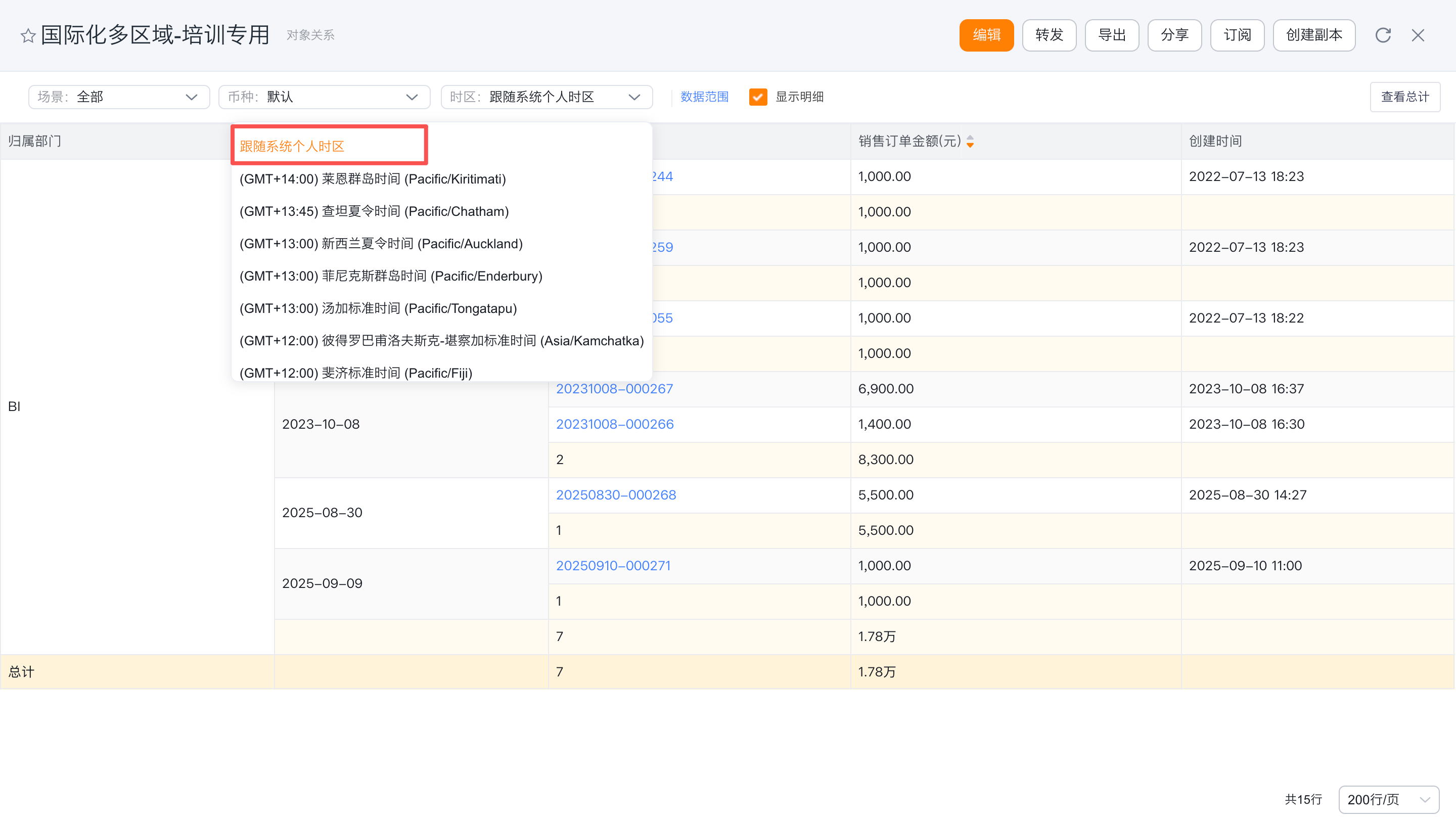 如果纽约分部的负责人想看纽约分部本月的订单数和订单金额。仅需要将数据范围处的归属部门改为:纷享销客纽约分部,时区选择纽约对应的时区西五区。伦敦分部同理。