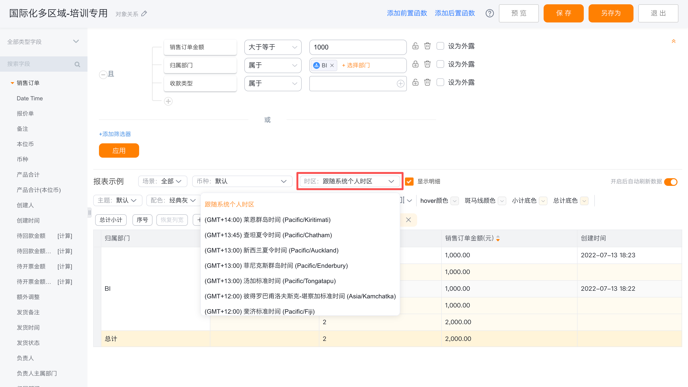 第一步: 新建报表,选择【国际销售订单】对象,订单提交时间选择本月,归属部门选择纷享销客北京分部。拖入对应的字段“归属部门”、“订单ID”、“订单金额”。时区选择东八区。