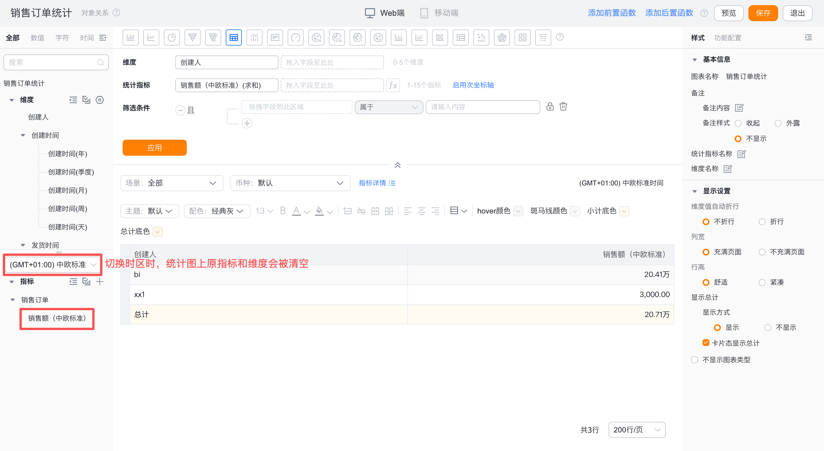 - 开通多时区且BI测灰度了多时区分析能力的企业,在新建报表时,报表会默认按照创建人的个人时区回显数据。