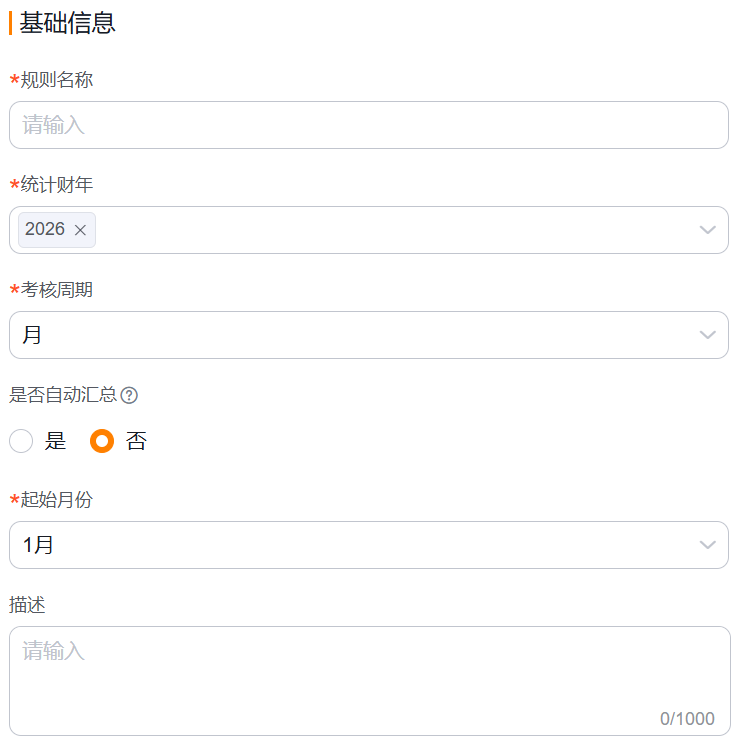 - 考核周期:定义多维度目标规则的考核周期,可选年、季度、月、周;