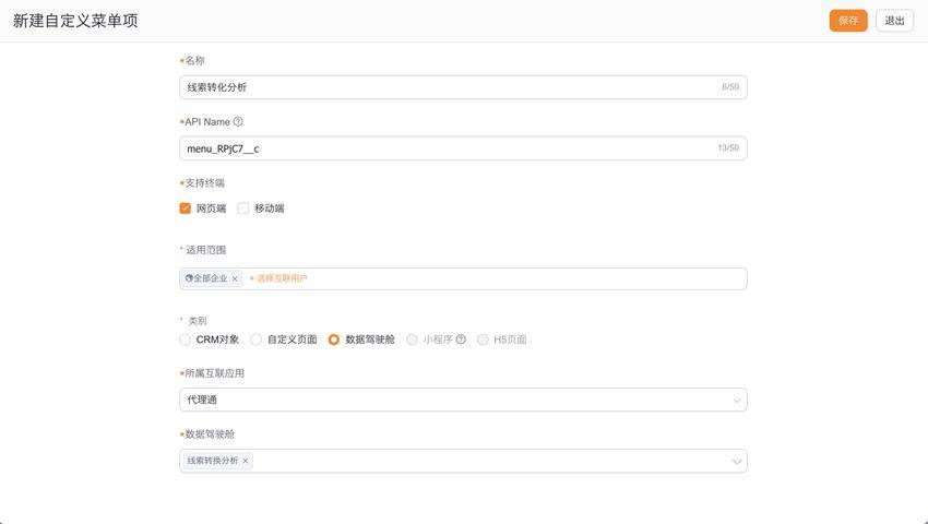 渠道门户的自定义菜单配置界面中。可选择上游企业中已配置好的的数据驾驶舱。