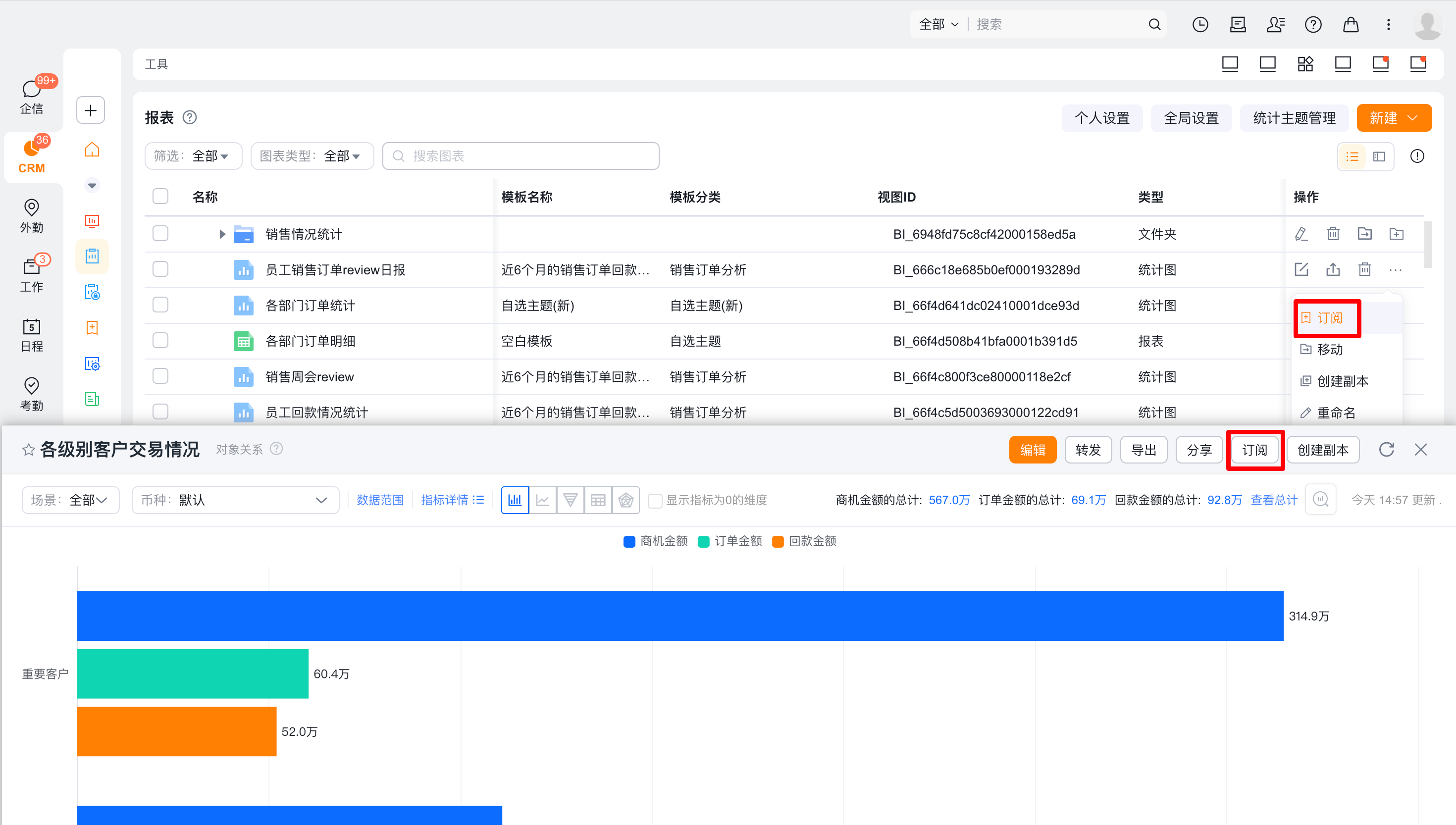 在图表的列表页和查看图表时都可以订阅相应的报表/统计图/数据驾驶舱,每个图表/数据驾驶舱只能被订阅一次。