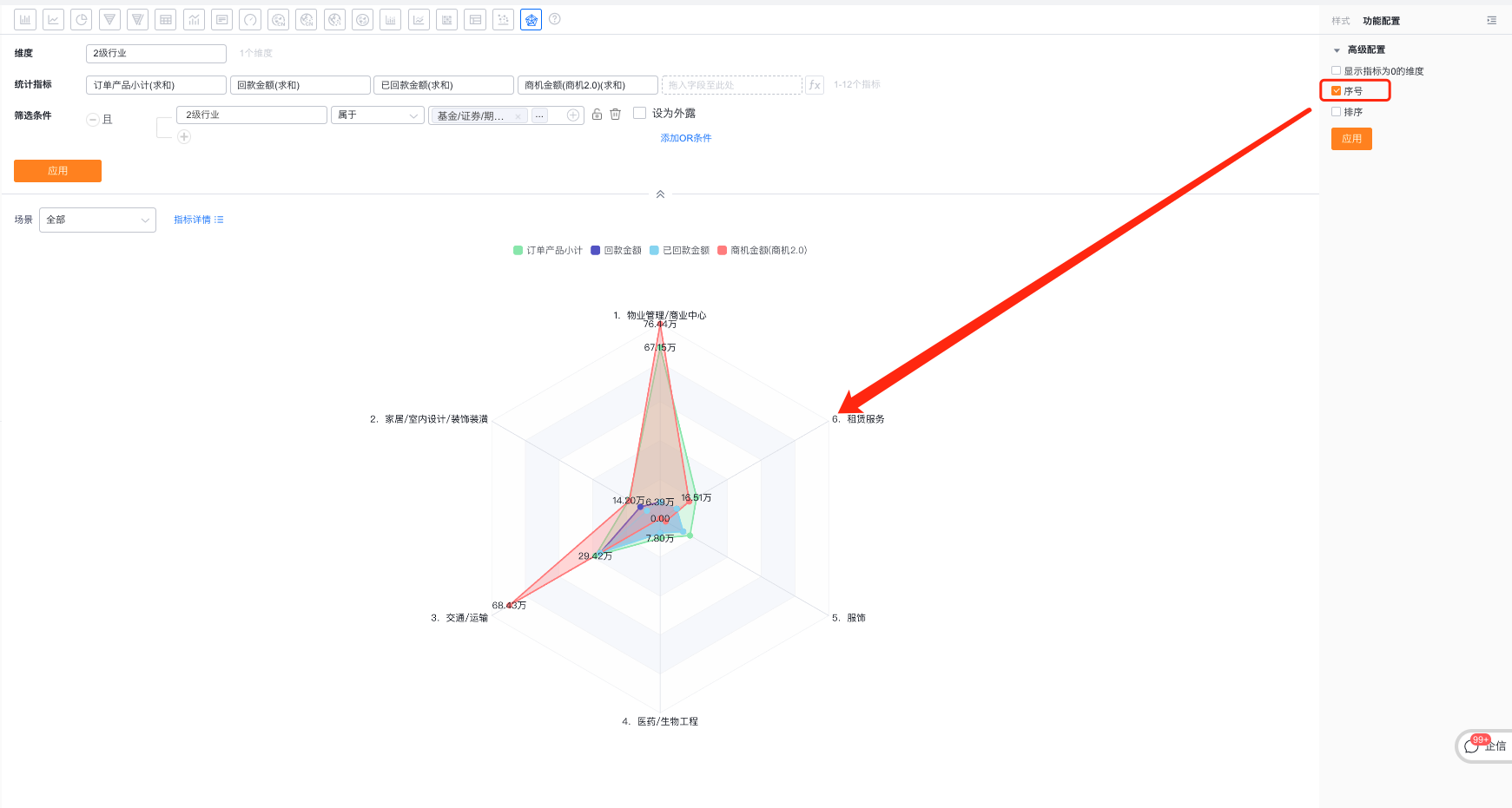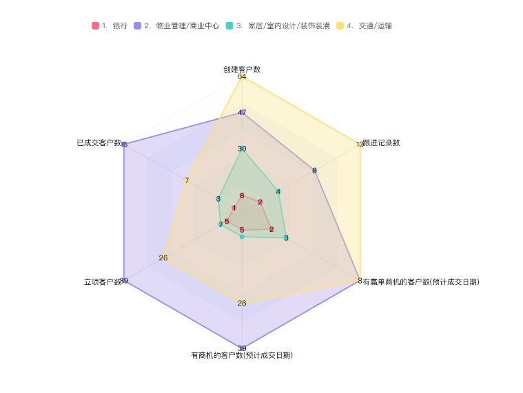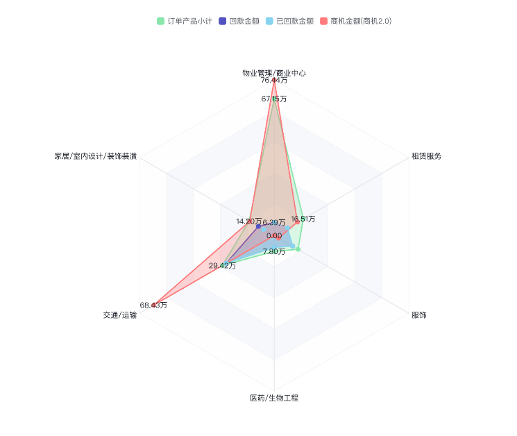雷达图以其独特的环形布局和多维度数据展示而闻名,使用户能够一目了然地比较多个变量的关系和趋势。例如维度雷达图(图1)可以对比不同行业的订单金额和回款趋势,而指标雷达图(图)可以通过图形化的呈现直观的展示所有行业中,在订单金额和回款趋势表现更好的行业等