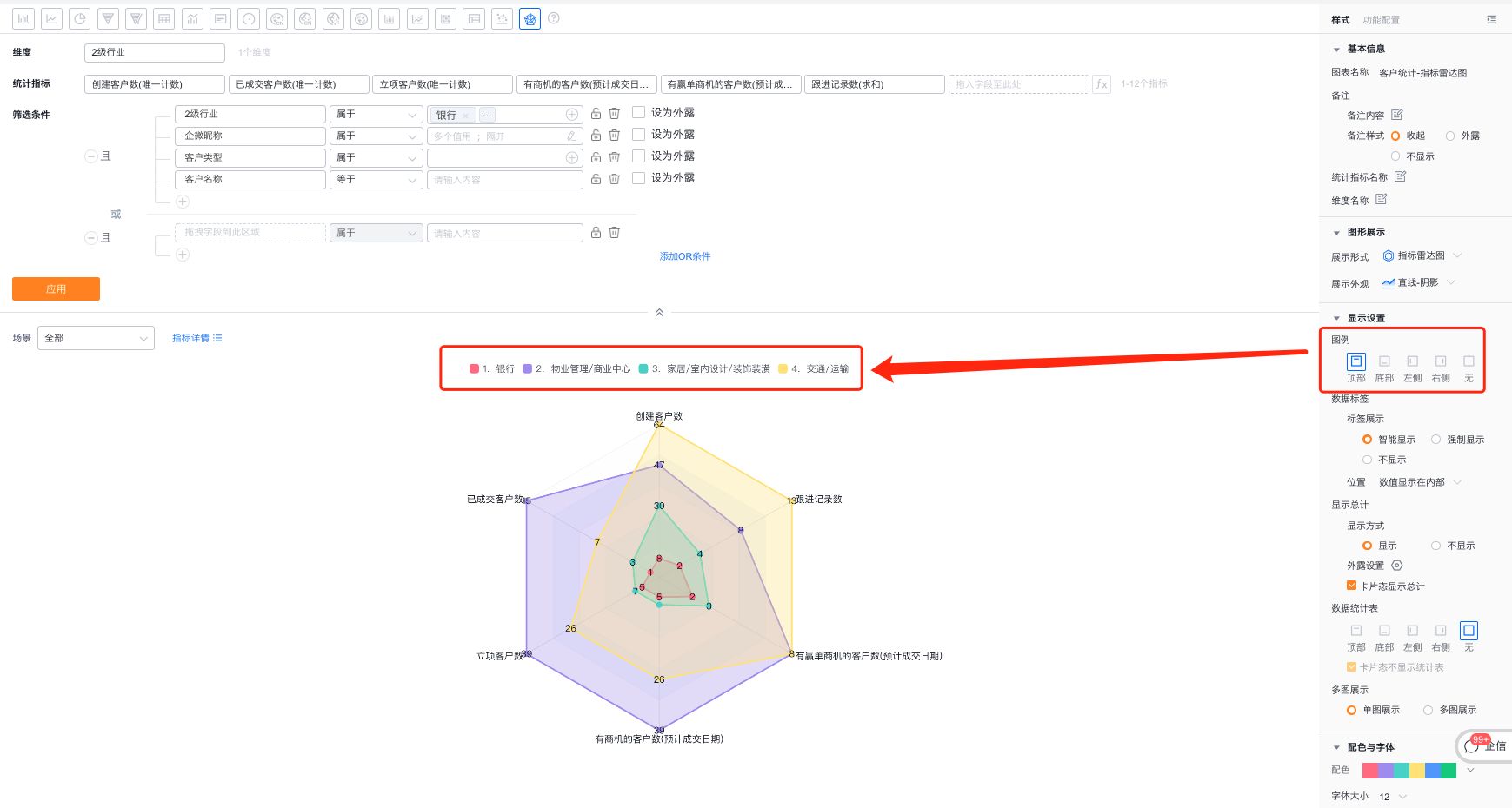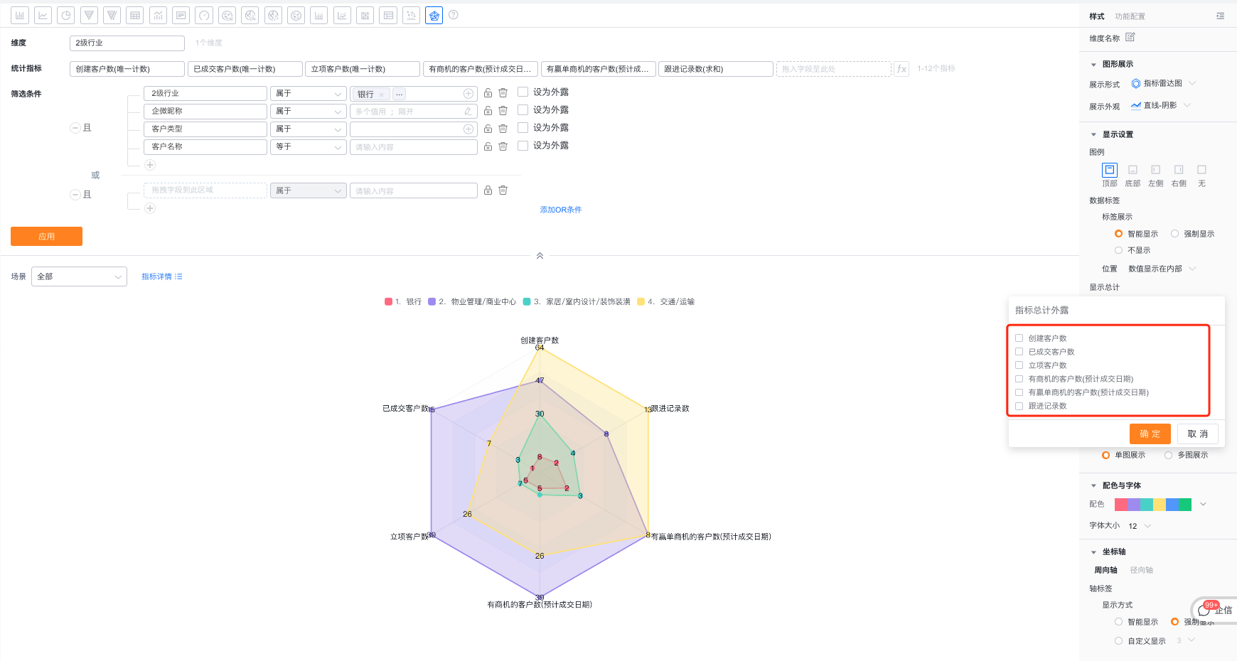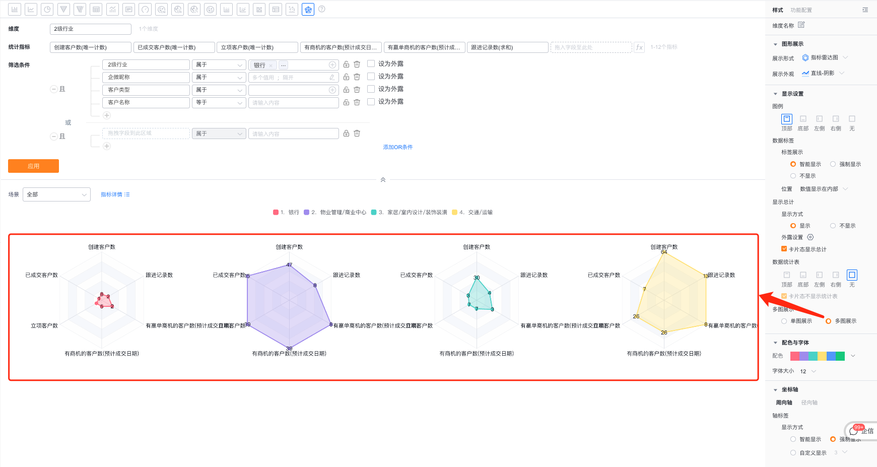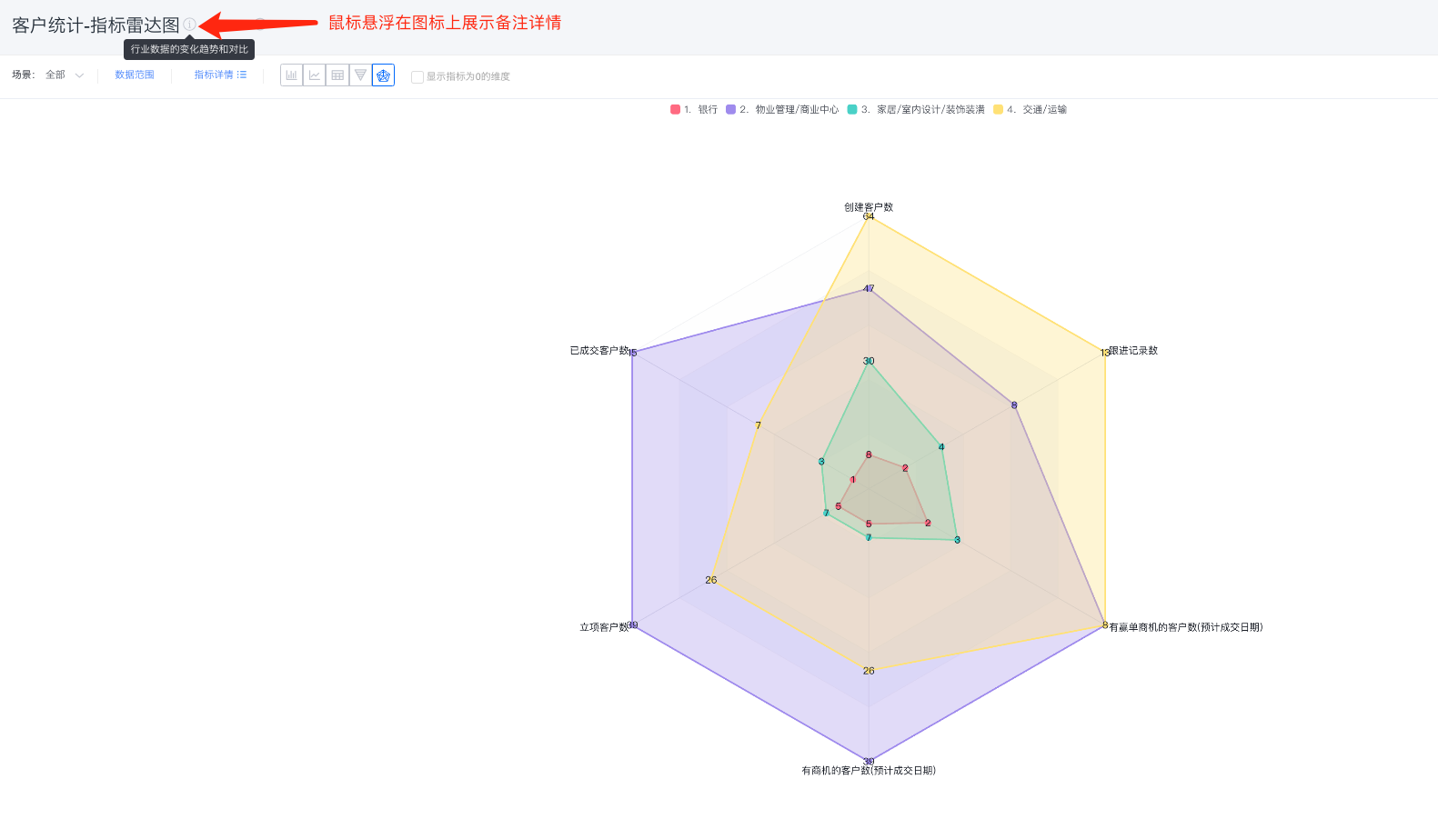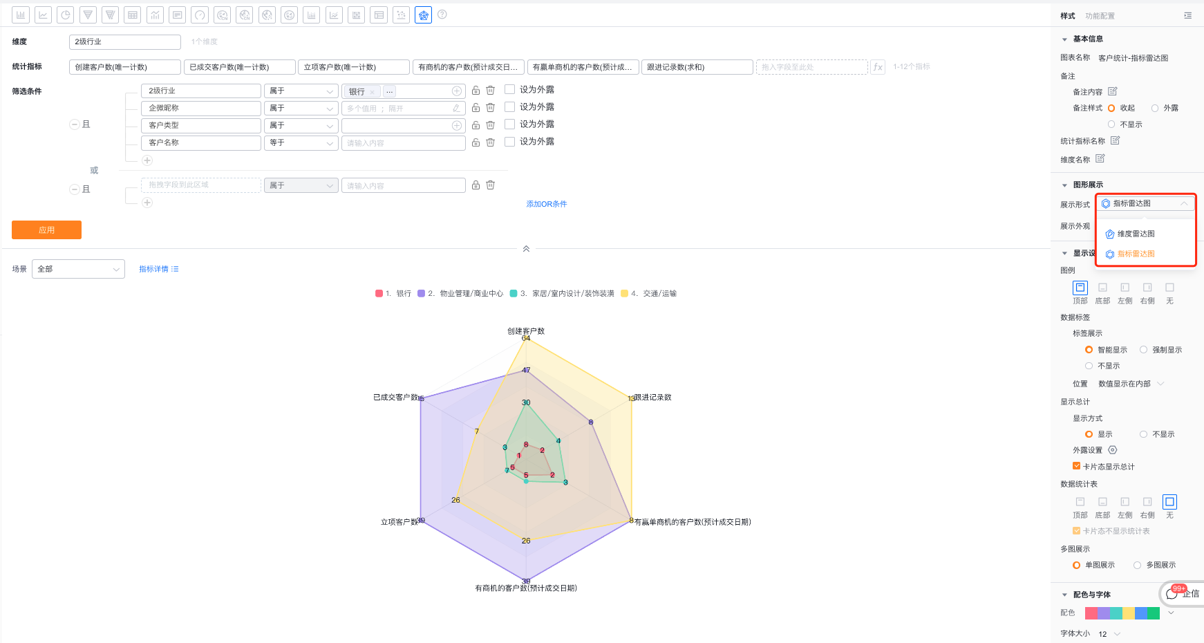- 展示形式:默认使用维度雷达图,可自定义切换为指标雷达图
