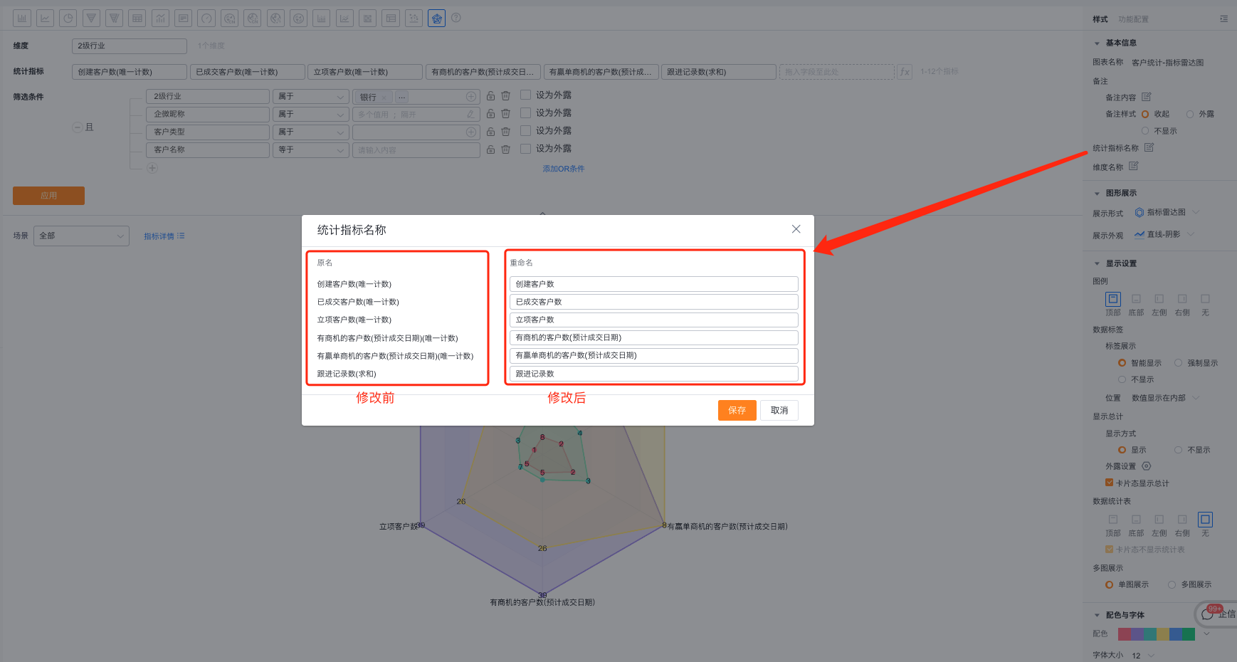 - 统计指标名称:默认按指标名称展示,可自行修改展示内容