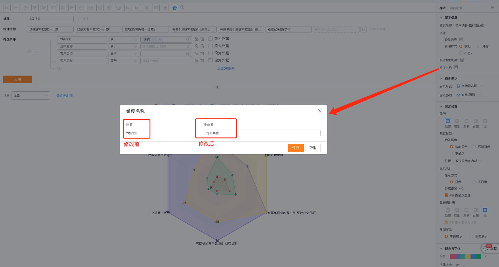 - 维度名称:默认按维度名称展示,可自行修改展示内容