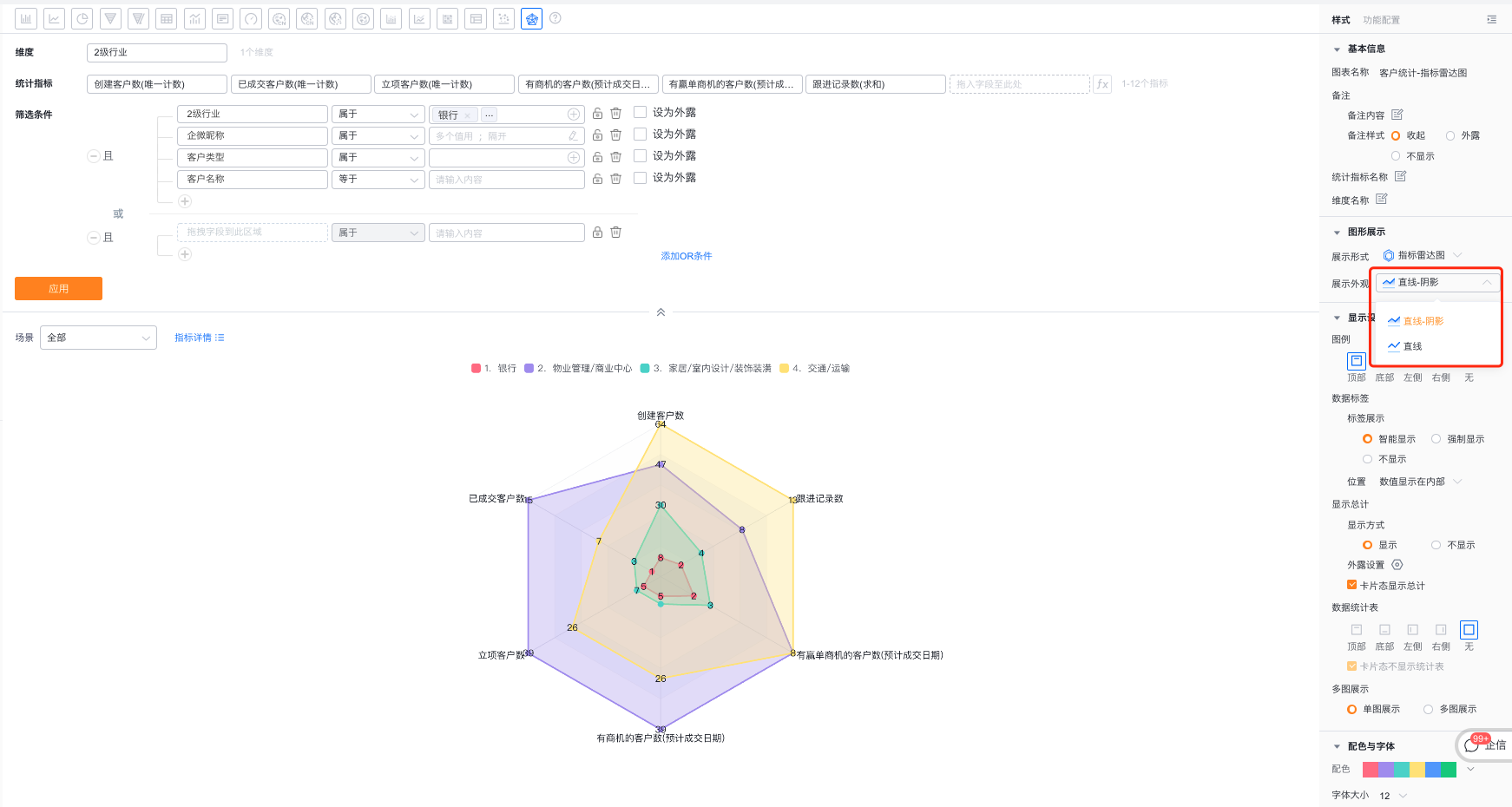 *指标雷达图:雷达图中的每一条半径代表一个指标,不同颜色绘制的多边形则代表维度,对应的交点则表示维度对应指标的数值; - 展示外观:默认按直线-阴影展示,可自定义切换按直线展示