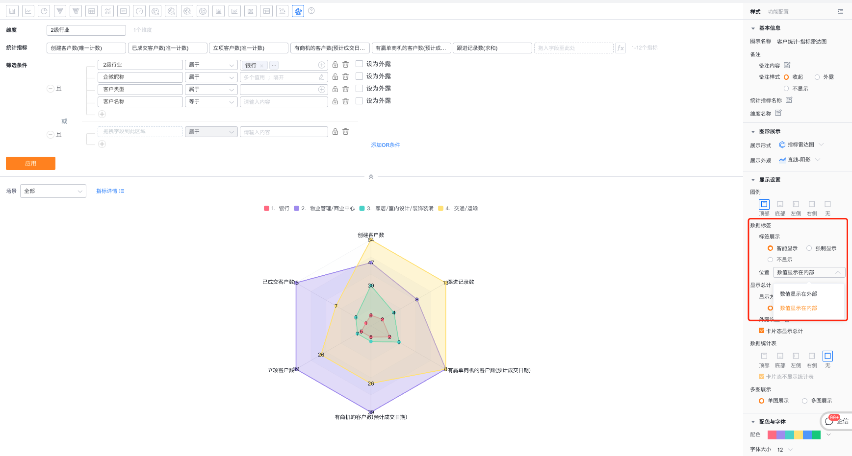 - 数值显示在内部:基于图表中的数值展示的位置,围绕图上的点,可以设置数值是在点的内部