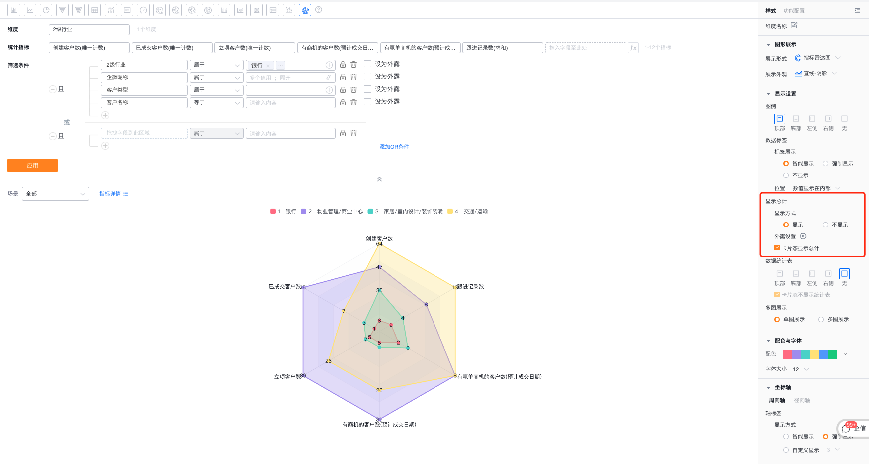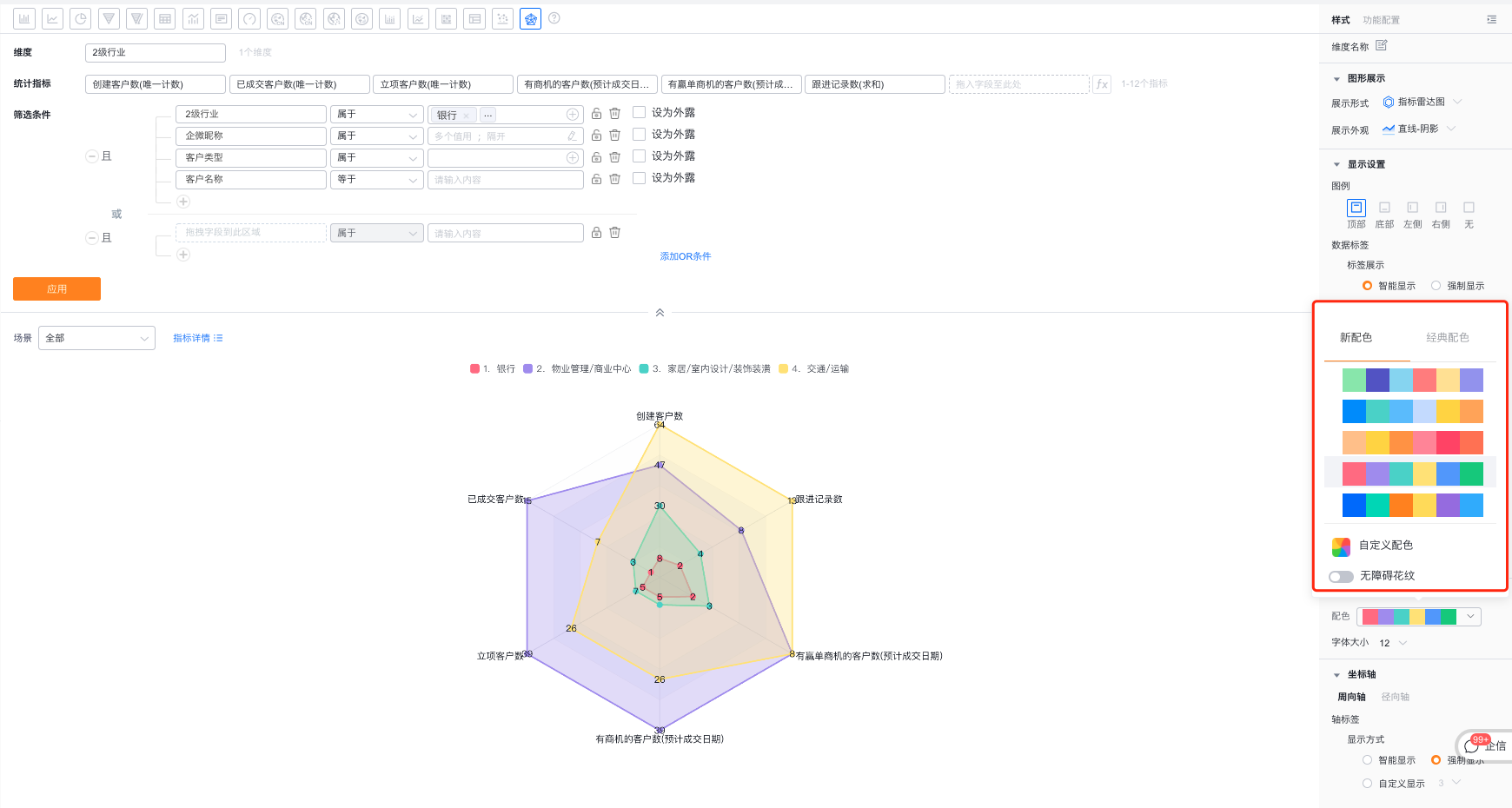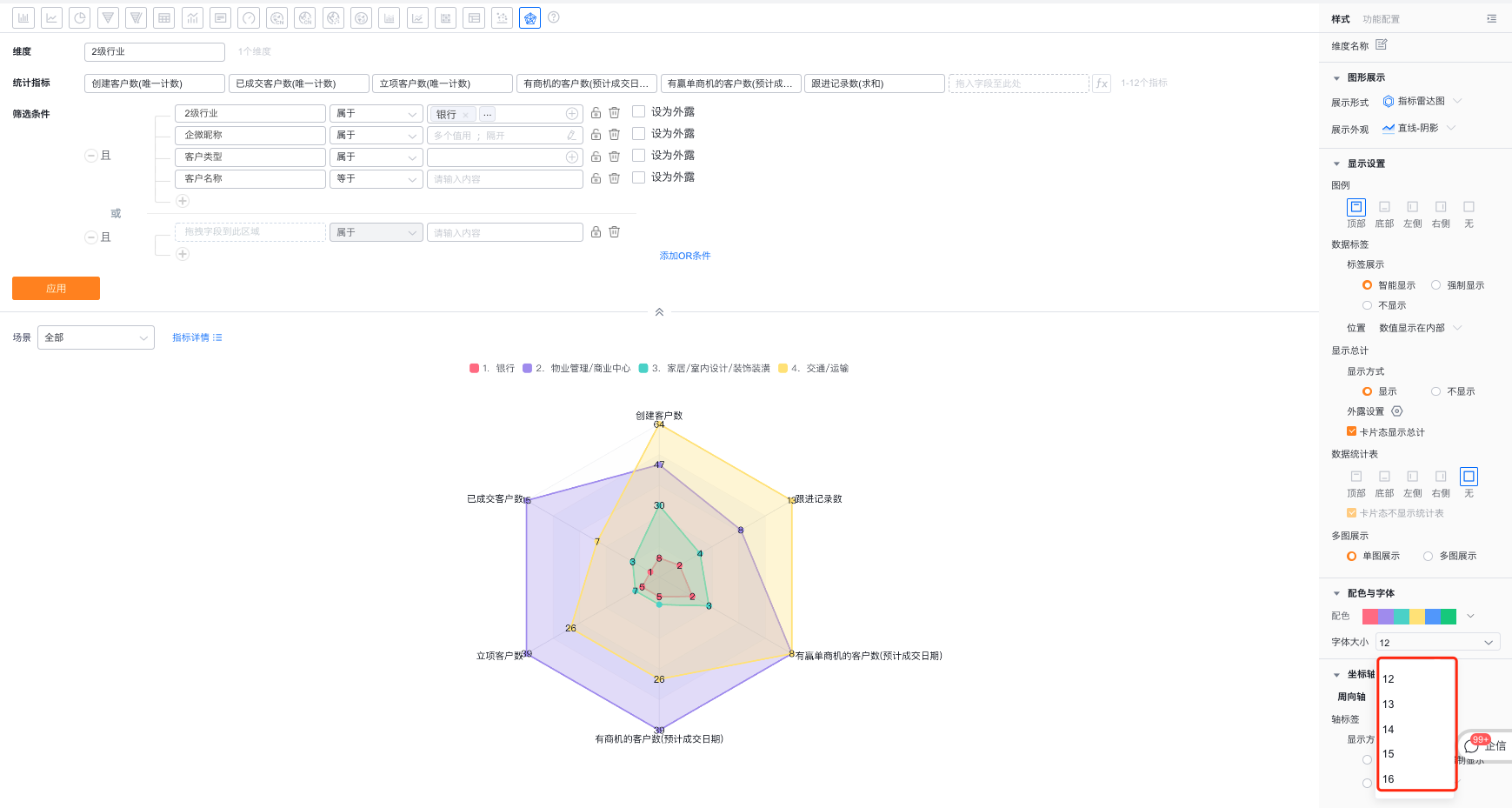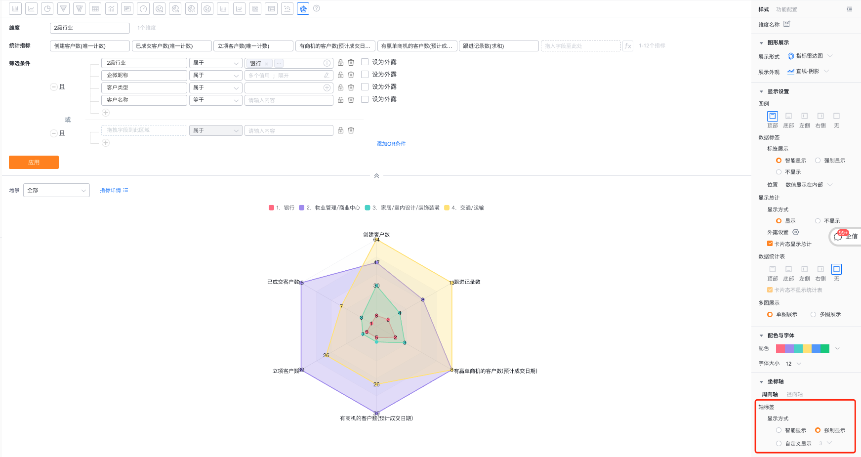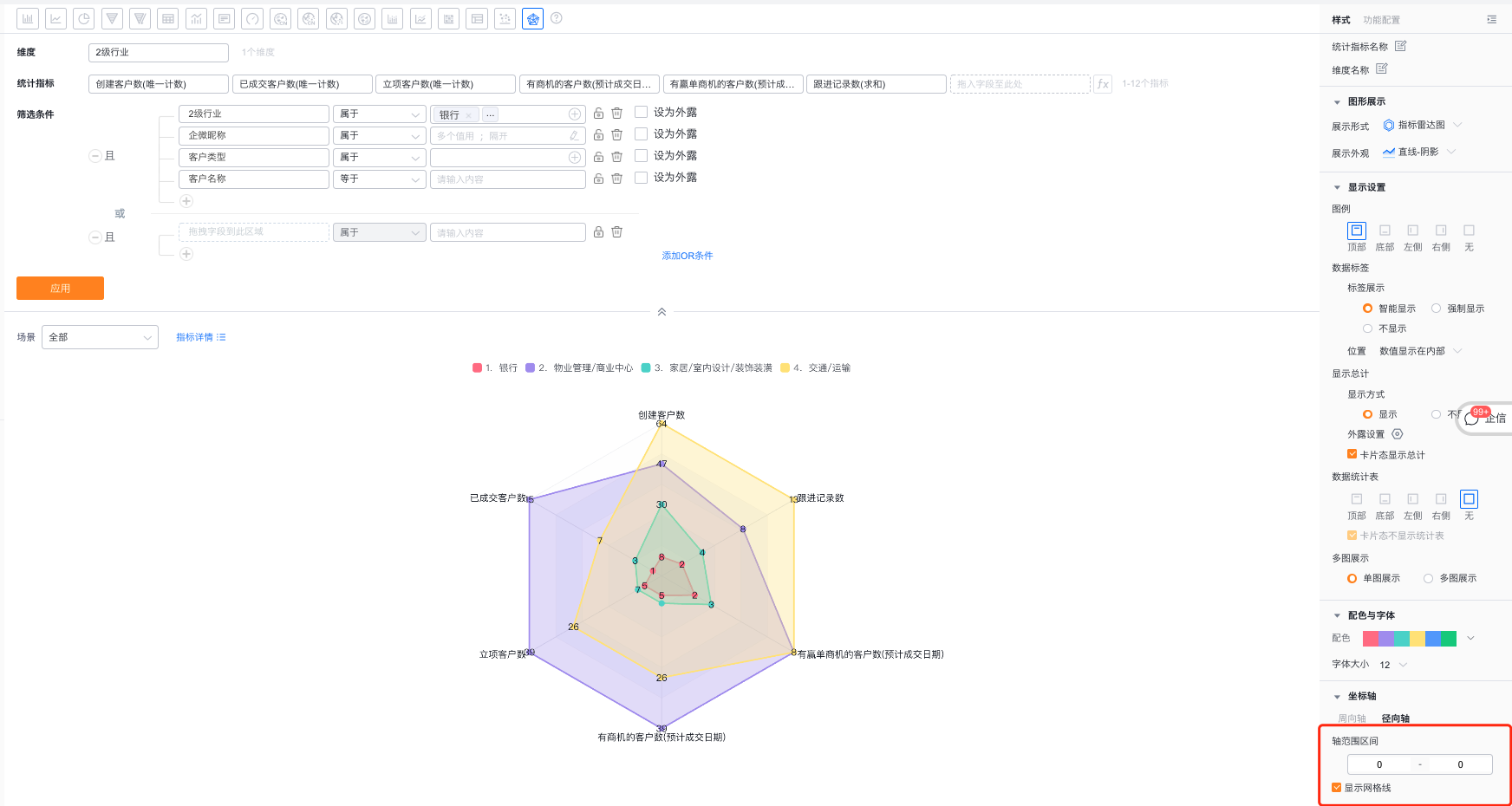 - 轴范围区间:支持用户自定义调整径向轴的轴范围最大最小值,默认是按照指标的最大最小值设置的