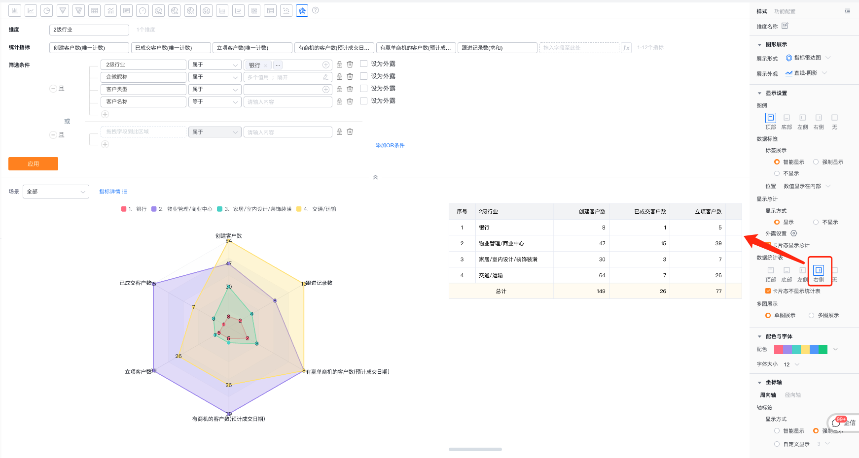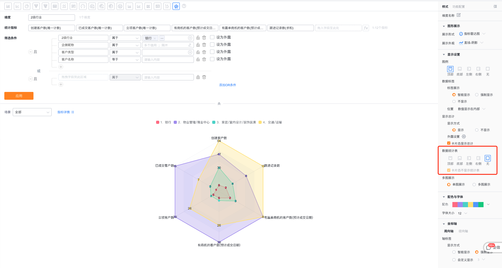 - 数据统计表:可设置是否展示数据统计表及展示位置,默认不展示,可切换为展示在图形的顶部、底部、左侧、右侧