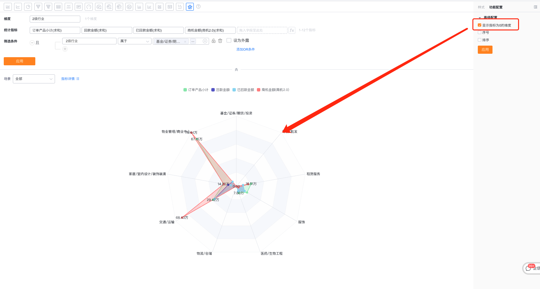 - 显示指标为0的维度:默认不勾选,可勾选后展示指标为0的维度