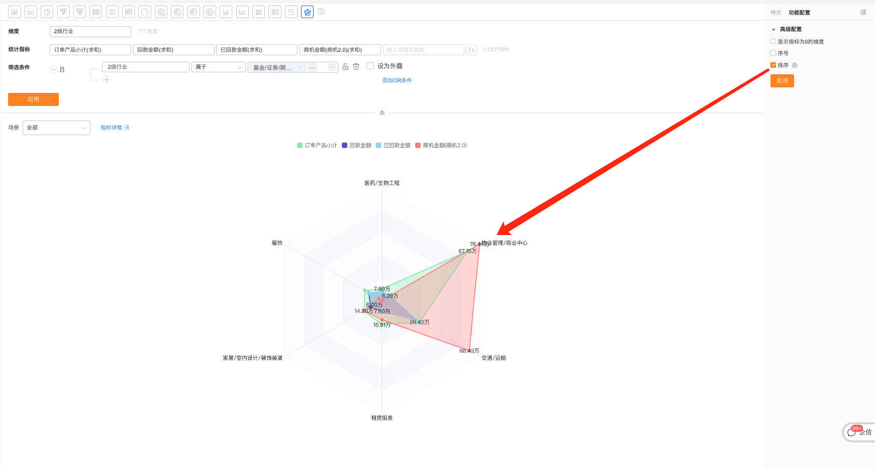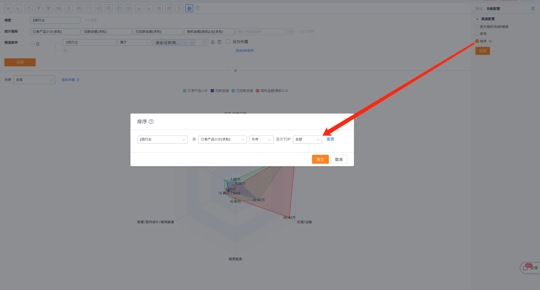 - 当维度时枚举值或者部门字段时,支持自定义排序