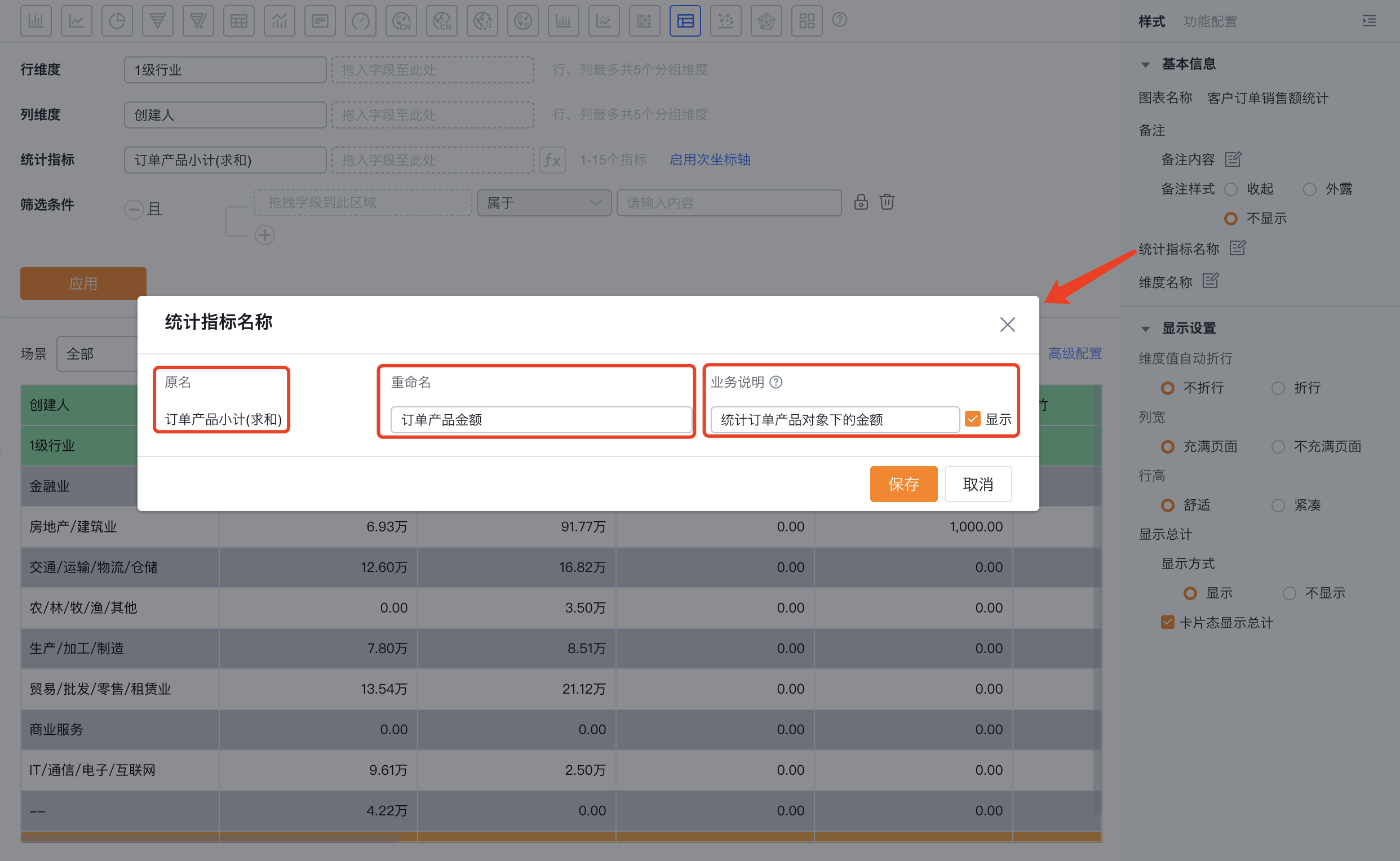 - 统计指标名称:默认按指标名称展示,可自行修改展示内容,以及可自定义添加业务说明并支持配置是否显示