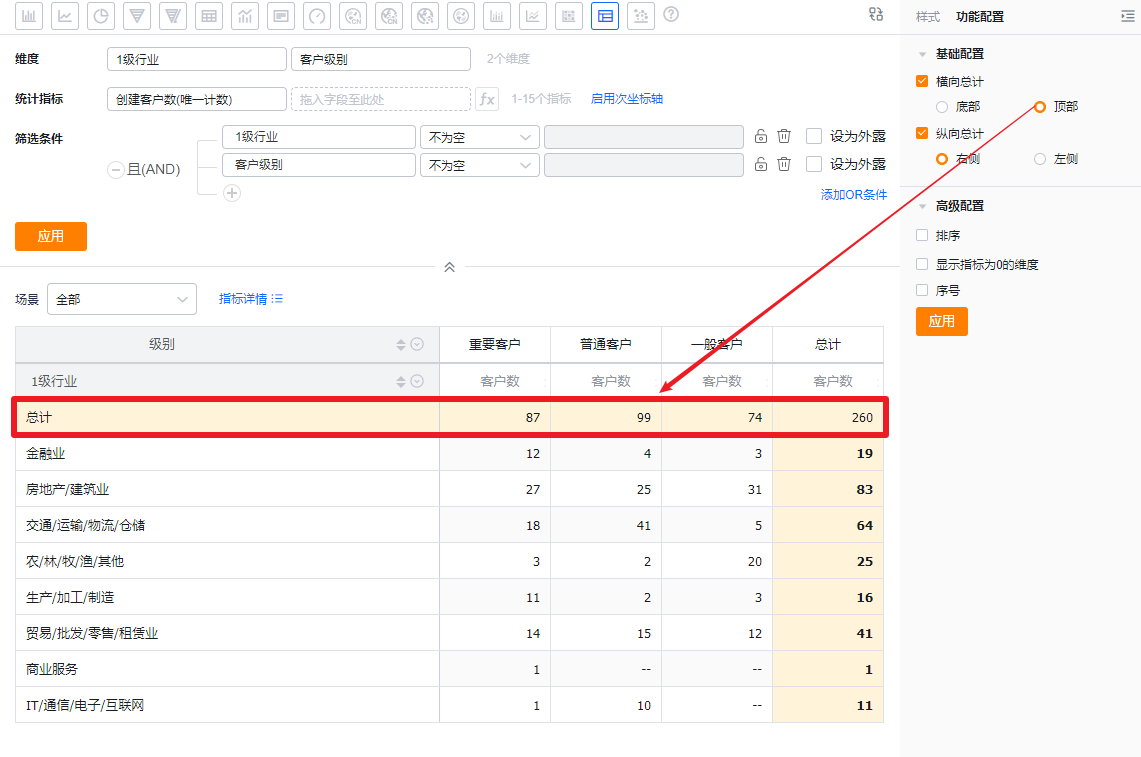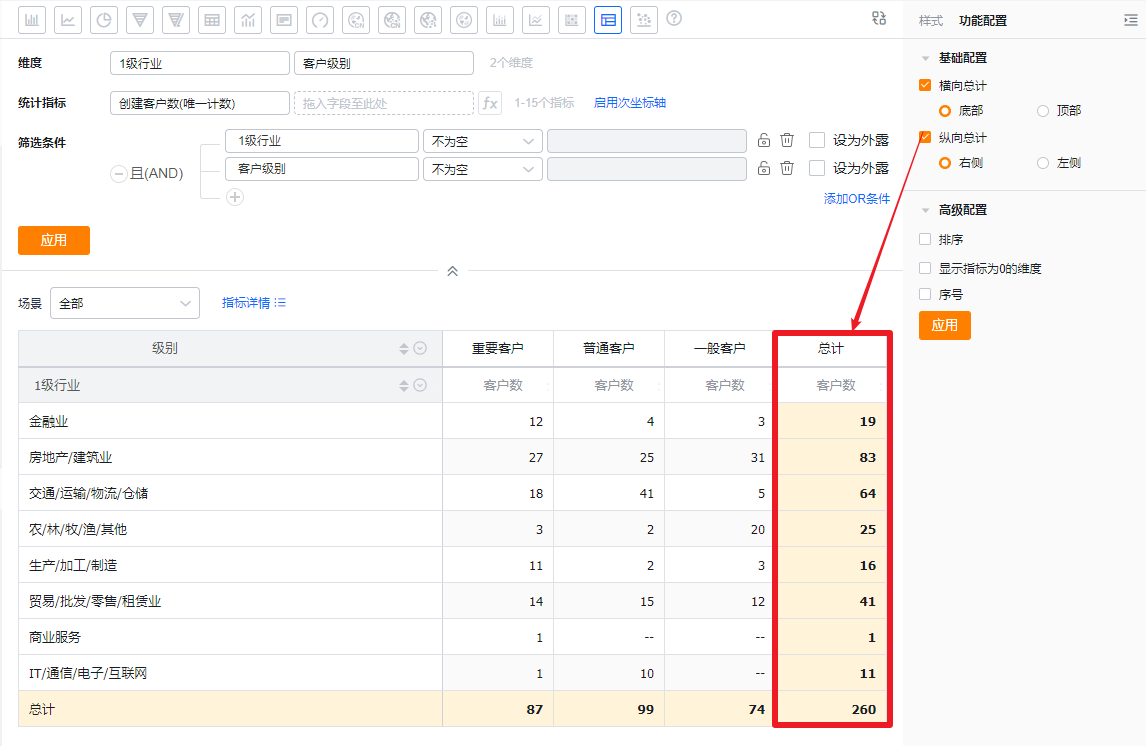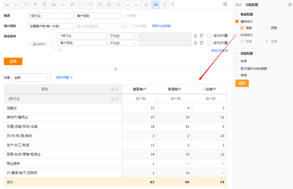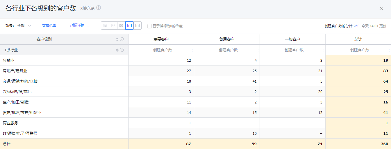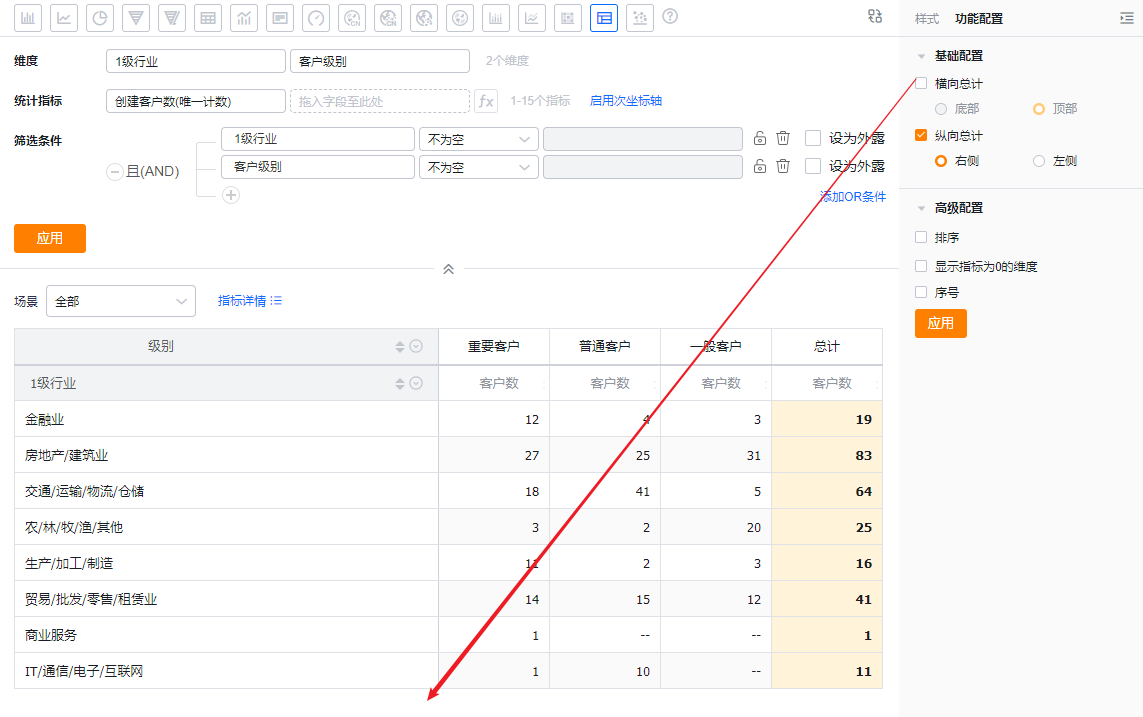交叉表可以展示横纵两个维度在一定数据范围内的数据情况。例如,交叉表可以对比不同行业下不同客户级别从线索到订单的情况等