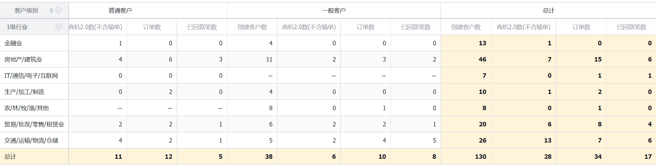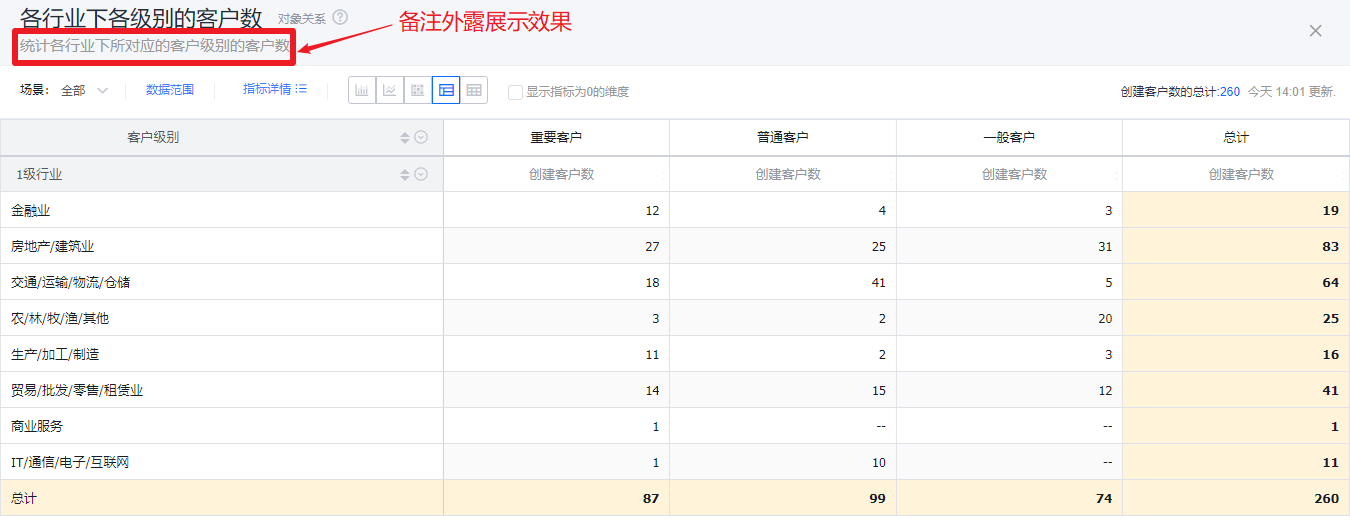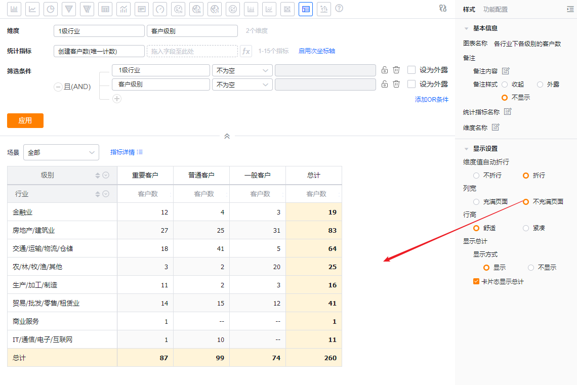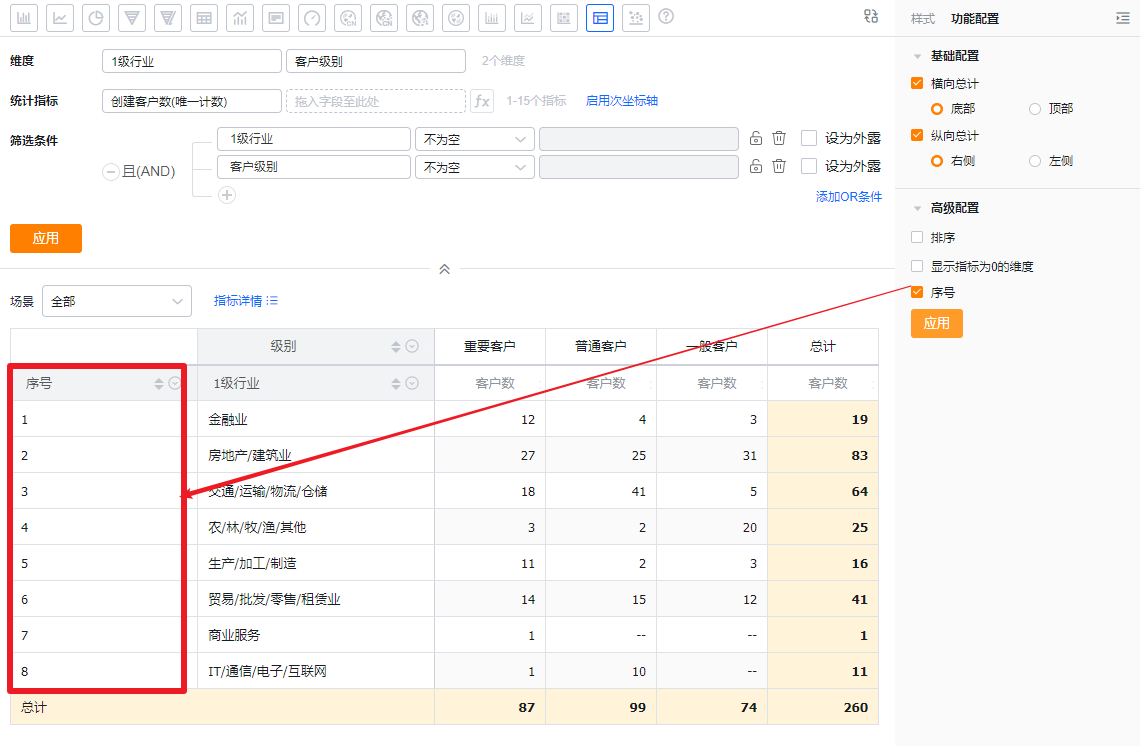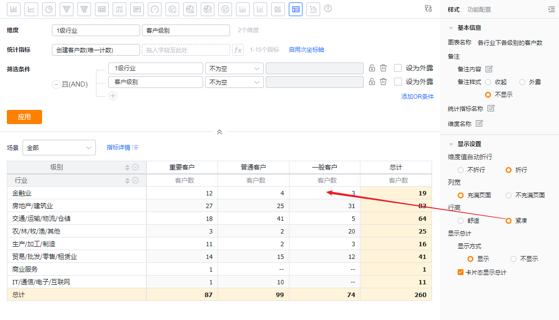 交叉表可以展示横纵两个维度在一定数据范围内的数据情况。例如,交叉表可以对比不同行业下不同客户级别从线索到订单的情况等