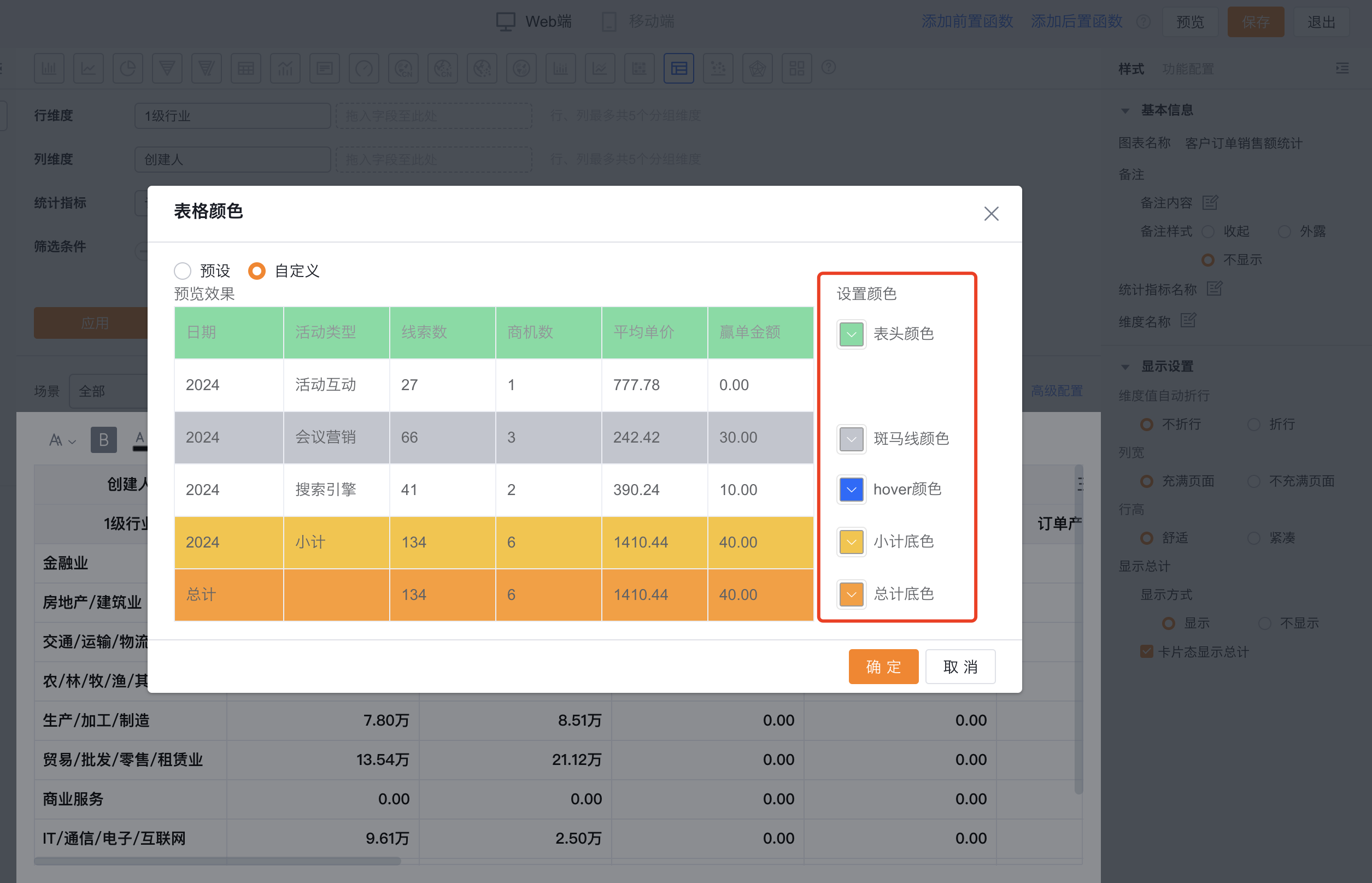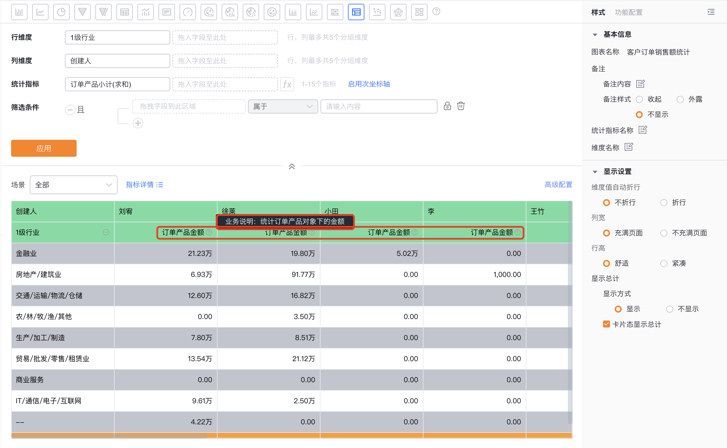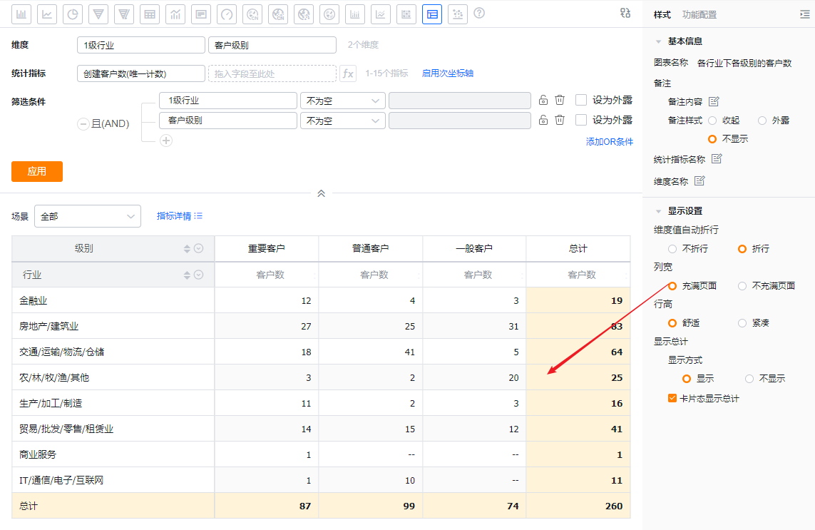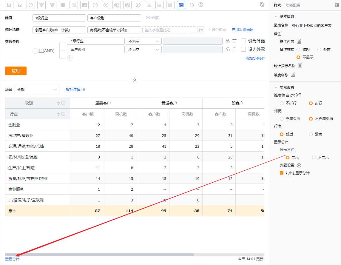 交叉表可以展示横纵两个维度在一定数据范围内的数据情况。例如,交叉表可以对比不同行业下不同客户级别从线索到订单的情况等