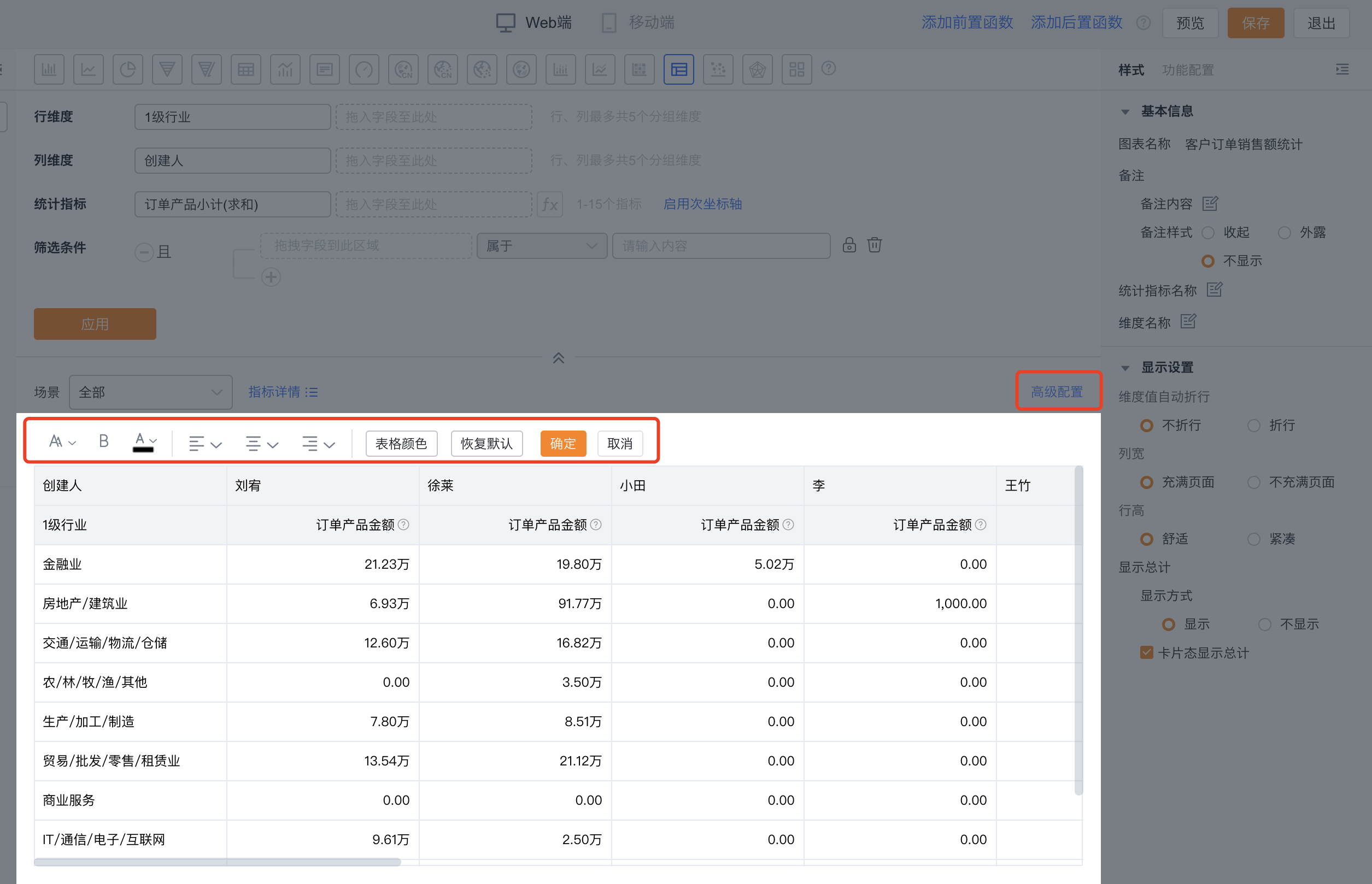 - 高级配置:用户可通过高级配置自定义设置表格的字号大小、加粗、字体颜色、居中样式、表格样式,以及恢复默认